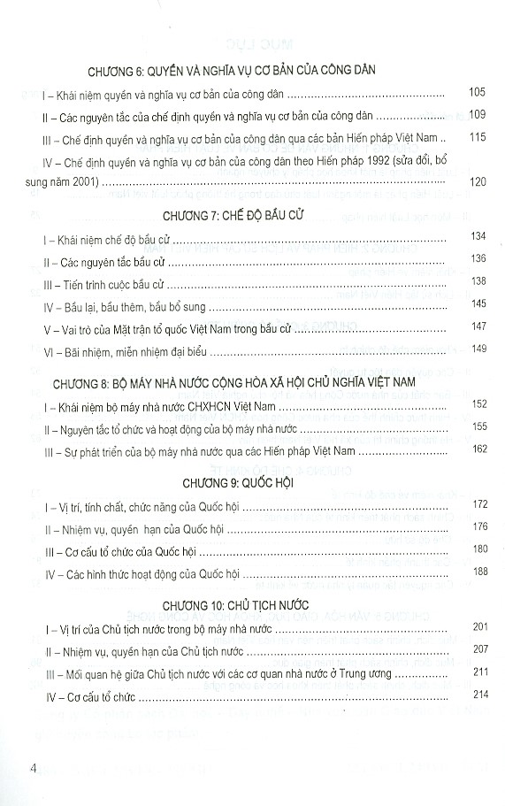 Chương 1: Những vấn đề cơ bản về luật hiến pháp. Chương 2: Hiến pháp và lịch sử lập hiến Việt Nam. Chương 3: Chế độ chính trị. Chương 4: Chế độ kinh tế. Chương