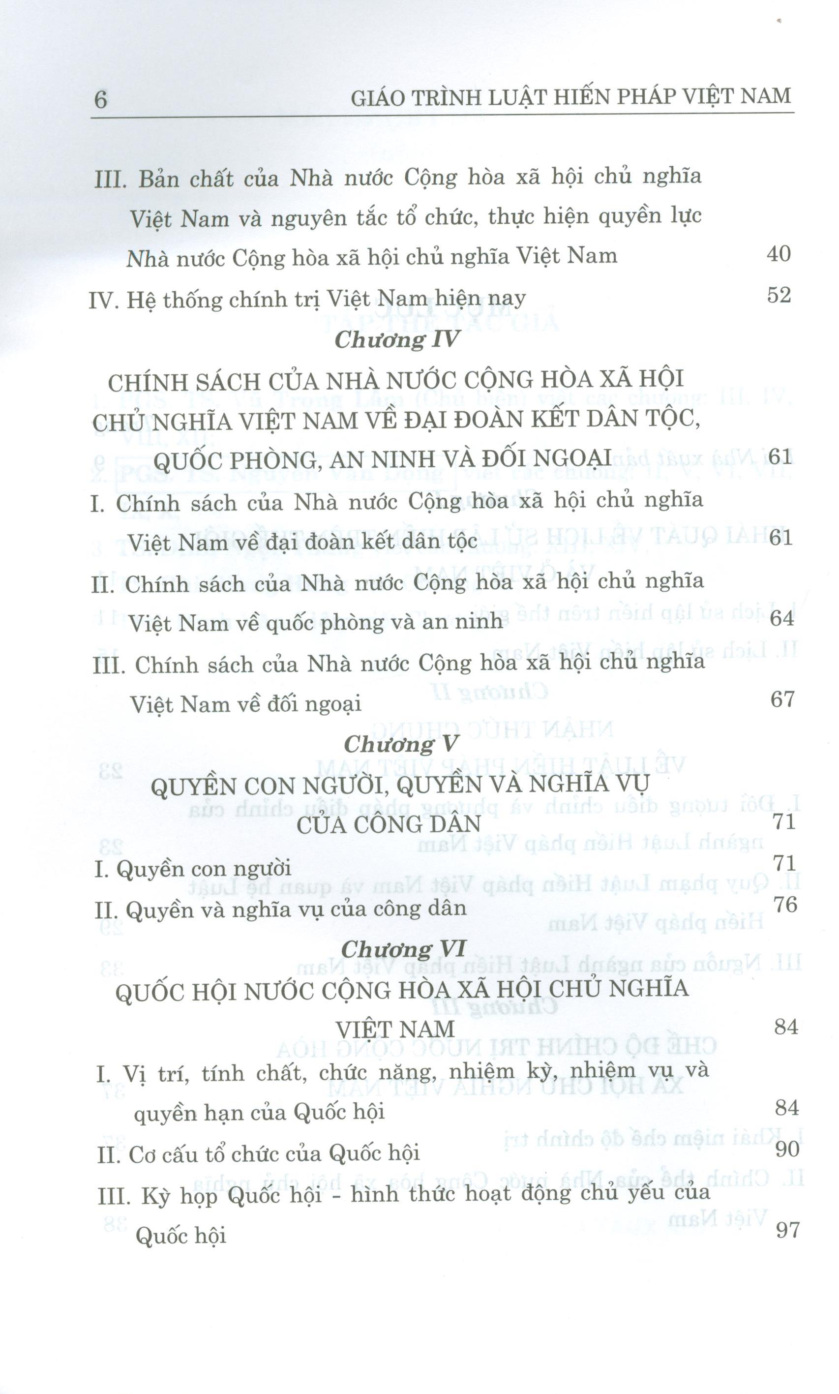 Chương 1: Những vấn đề cơ bản về luật hiến pháp. Chương 2: Hiến pháp và lịch sử lập hiến Việt Nam. Chương 3: Chế độ chính trị. Chương 4: Chế độ kinh tế. Chương