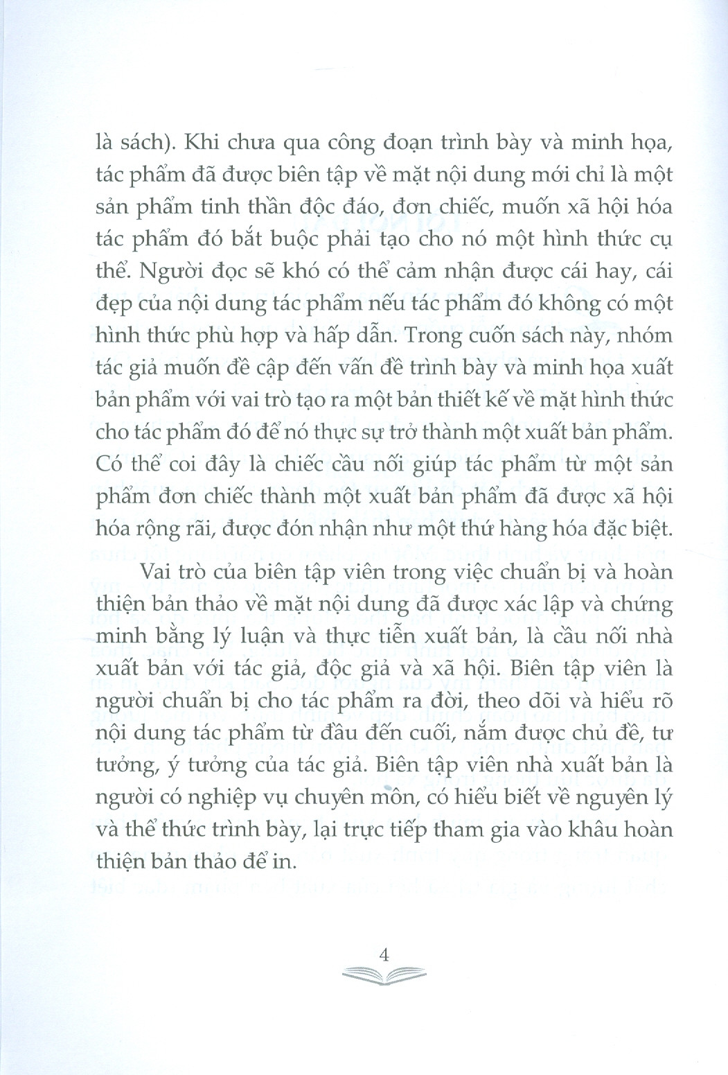 Trình bày và minh họa là một khâu quan trọng trong quá trình xuất bản xuất bản phẩm, góp phần nâng cao chất lượng và giá trị xã hội của xuât bản phẩm ( đặc biệt là sách). Người đọc sẽ khó có thể cảm nhận được cái hay, cái đẹp của nội dung tác phẩm nếu tác phẩm không có một hình thức phù hợp và hấp dẫn