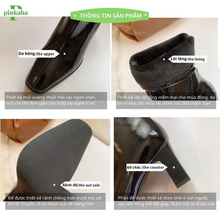 - Chất liệu: Chất da PU bóng có co giãn ( nên không có khóa vẫn xỏ chân vào được bình thường ạ). Bên trong có lót nỉ nhẹ