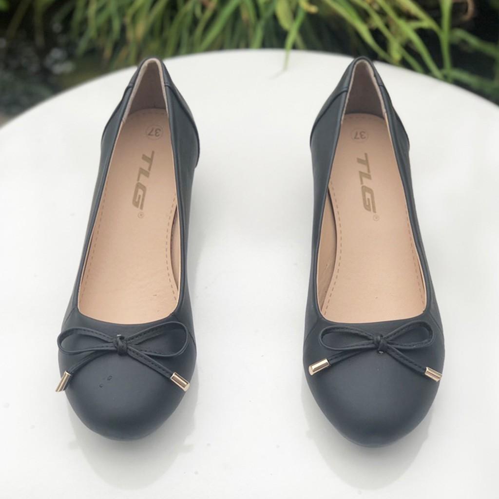 Giày đế xuồng 3cm đính nơ đen Trường Hải da bò thật
