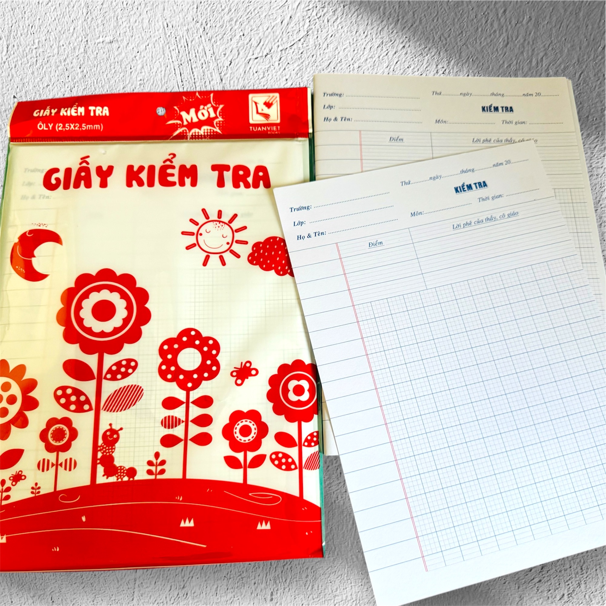 Mua tại TiktokTHÔNG TIN SẢN PHẨM: Giấy kiểm tra Ôly: KT 17x24 ĐL100 gồm 12 tờ đôi + 6 tờ đơn Giấy kiểm tra Kẻ ngang: KT 18x25 ĐL 70 gồm 20 tờ đôi + 10 tờ đơn