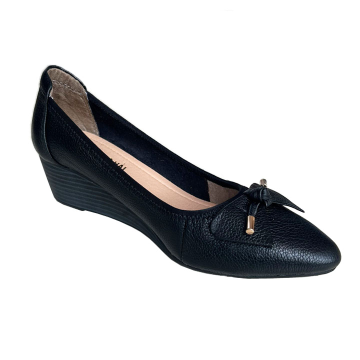 ✨Giày nữ mũi nhọn Đế Xuồng 5cm Da Bò đính nơ xinh xắn Màu Đen Trường Hải DX117Đ