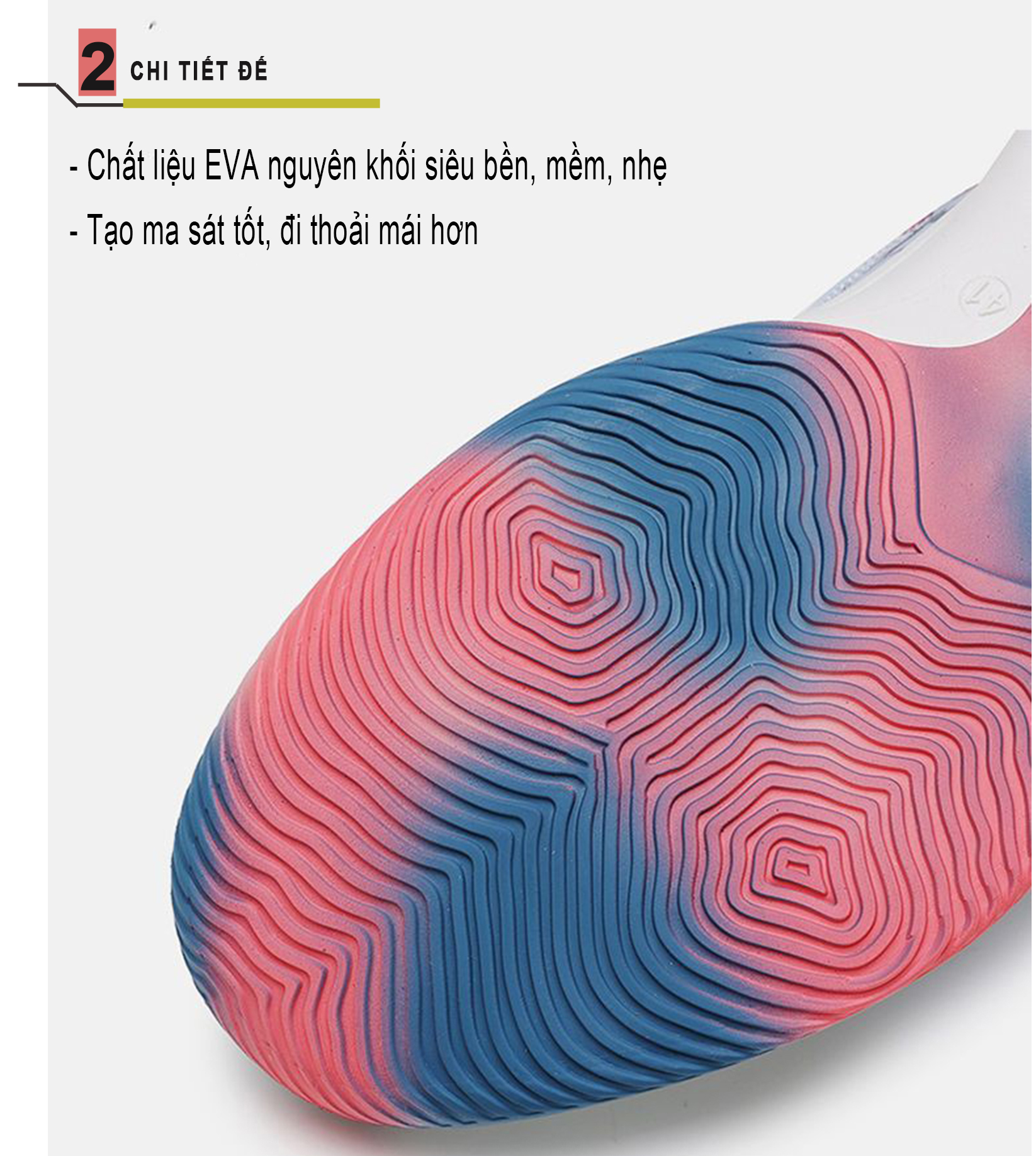 + Đế cao su chống trượt rất tốt. Đi lại nhẹ nhàng tạo cảm giác êm ái. + Trọng lượng nhẹ, thích hợp cho việc di chuyển dễ dàng + Thiết kế thoáng khí, hấp