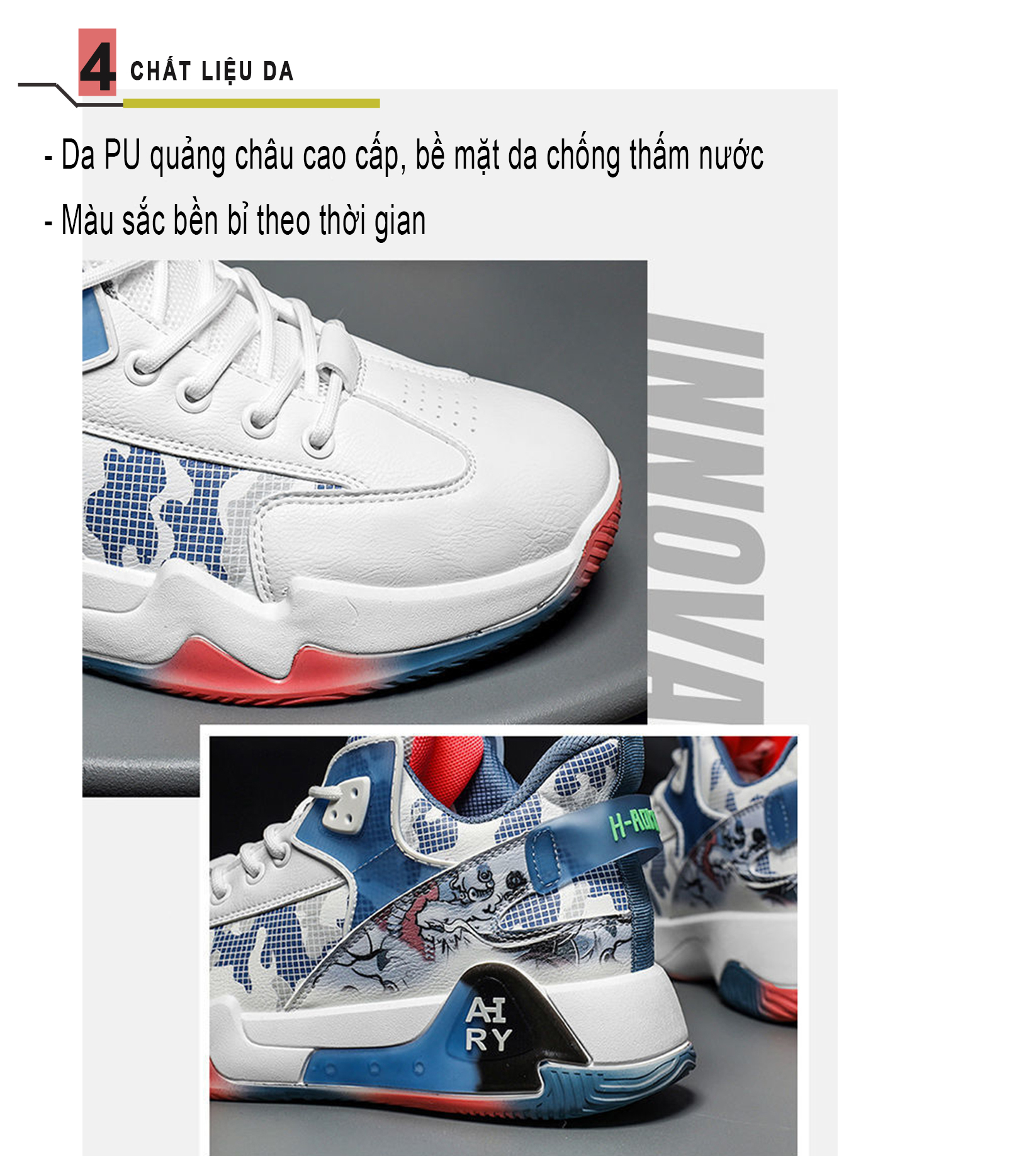 Thiết kế: có form giày Sneaker trẻ trung, năng động, phong cách cá tính Chất liệu: Phần trên của đôi giày được làm từ chất liệu da cao cấp và vải, mềm mại, giúp cho