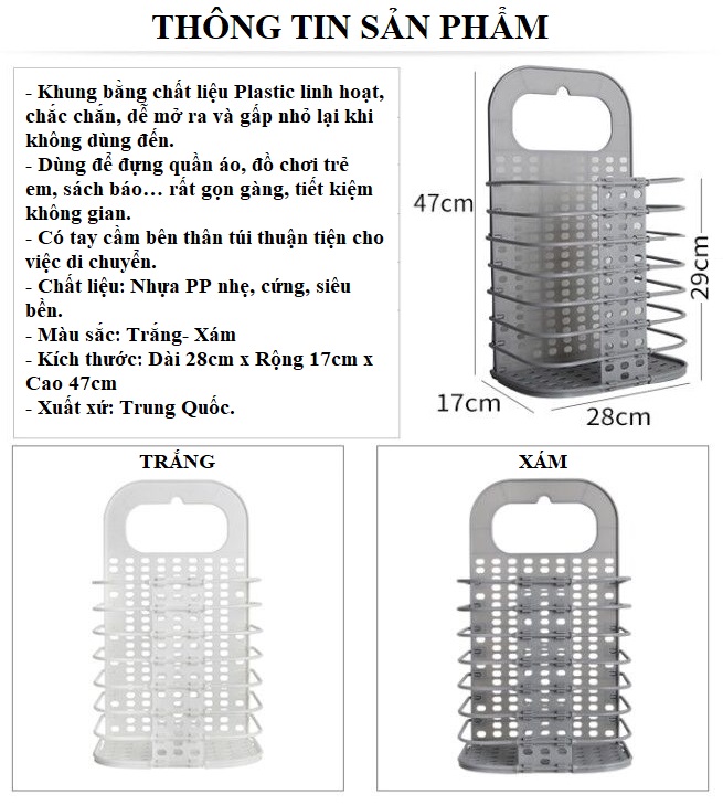 - Giỏ nhựa đa năng gấp gọn tiện lợi có thể treo mọi nơi với mọi loại tủ hay ngăn tủ thông thường, di chuyển dễ dàng mà không vướng và mất công tháo dỡ. Sản phẩm dùng đựng quần áo bẩn, các loại xà phòng, hộp đựng, giấy gói thực phẩm, hoặc rác thải cho phòng bếp, phòng tắm, phòng giặt là, phòng ngủ
