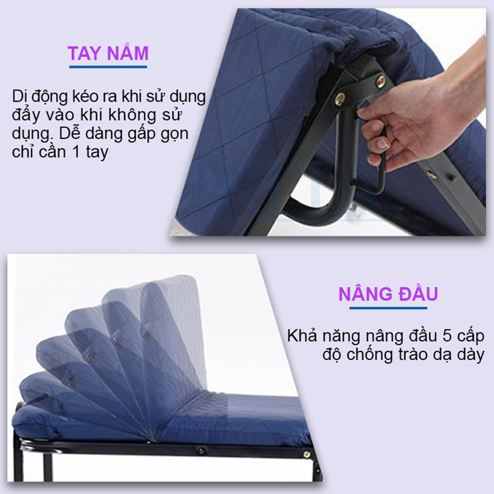 Giường gấp có nệm 3 khúc màu xanh, rộng 75cm nâng đầu 5 cấp độ, gấp gọn, tiện dụng Nikita ️ Giường gấp 3 khúc nâng đầu GB75 có phần khung làm bằng thép sơn