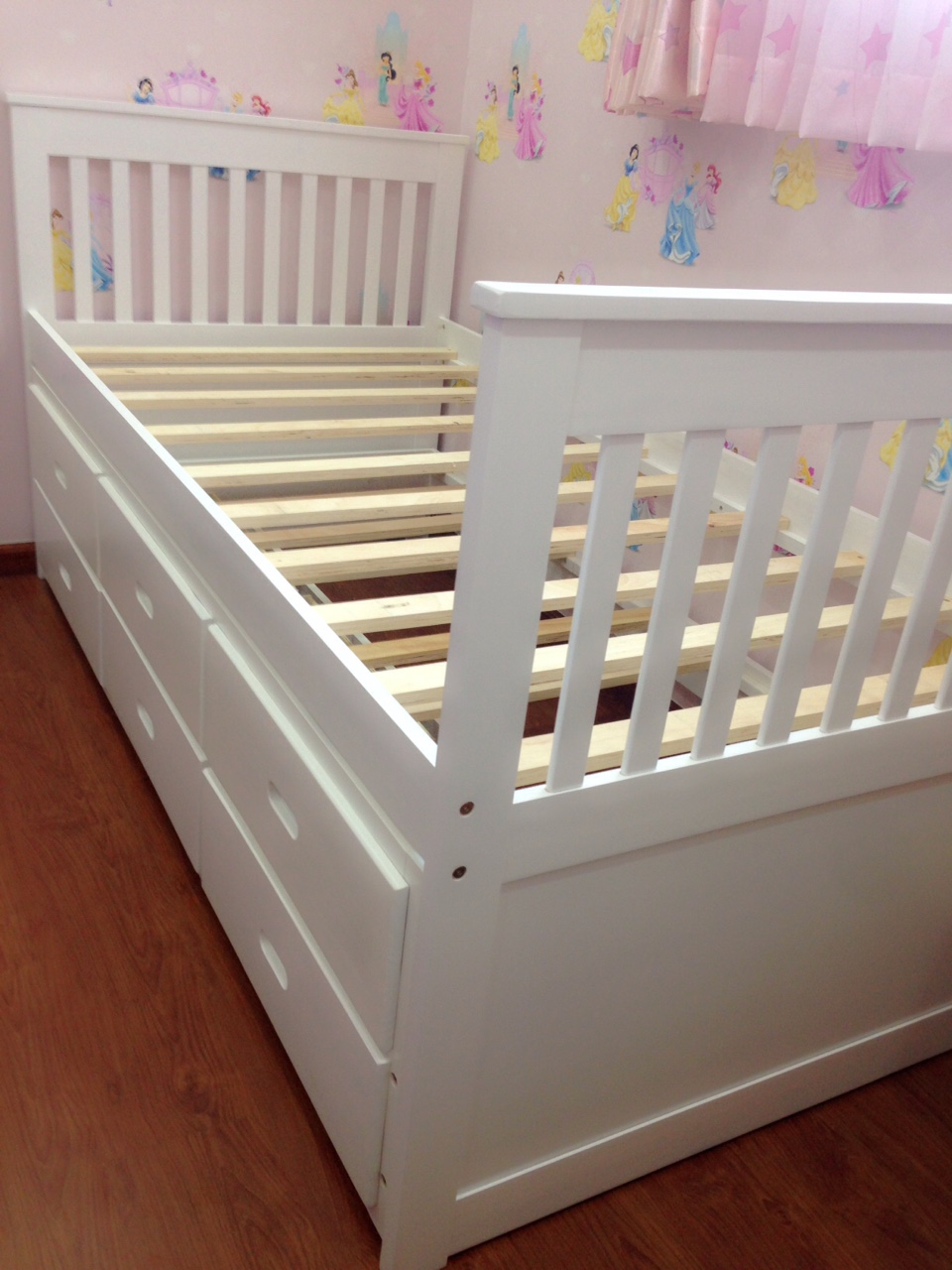 Giường tầng thấp XK Lincoln 1m/1m có kích thước lọt lòng giường trên/dưới là 100x193 cm, phủ bì 208x108x90 cm, chân trụ dày 30x60 mm chịu lực tốt. Ngoài ra, giường còn tích hợp 3 ngăn kéo để đồ tiện lợi, tiết kiệm không gian. Thang giường được làm từ gỗ Plywood chắc chắn, dẻo dai với 13 thanh (cung sinh) bắt vít. Chất liệu gỗ thông xẻ sấy nhập khẩu được gia công tỉ mỉ, kết cấu chắc chắn, giúp các bé vui chơi an toàn và có những giấc ngủ ngon. Giường có 2 loại kích thước là 1m/1m và 1m2/1m2. Tùy nhu cầu, Quý khách có thể chọn loại chỉ giường để gầm thông thoáng, thêm ngăn kéo để đồ hay thêm giường kéo tăng chỗ ngủ. Kích thước DxRxC cả 2 hộc kéo là 95x11x40 cm, giường kéo là 100x185 cm. Miễn phí lắp đặt tại TP.HCM, Bình Dương, Đồng Nai.