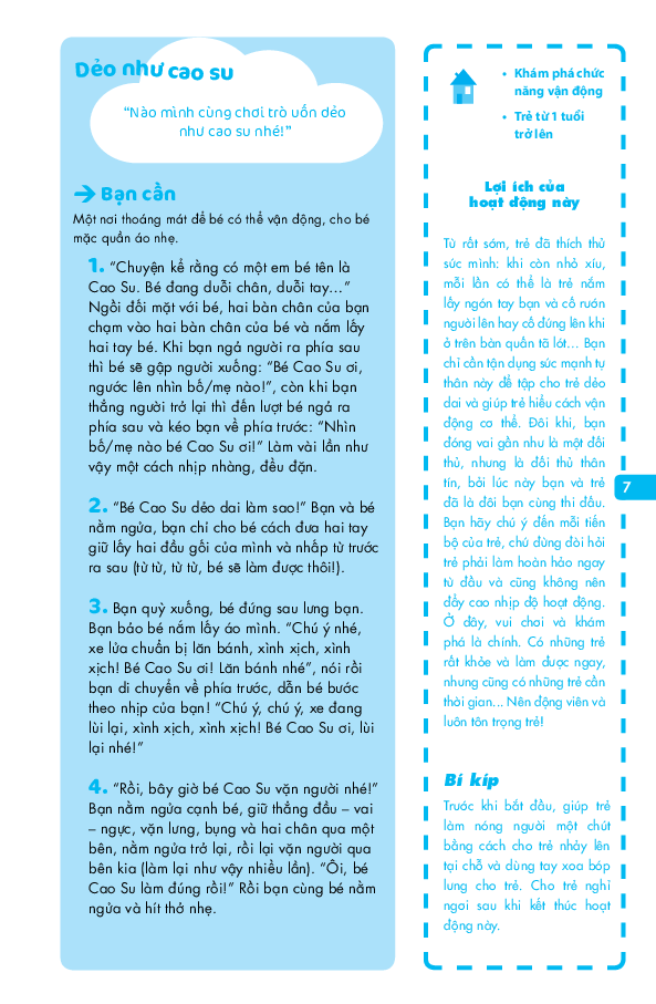 Từ lúc chào đời cho đến khi ba tuổi, đó là khoảng thời gian trẻ tìm cách giao tiếp và, từng bước, thử gắn kết những gì trẻ nhìn thấy với bản thân mình: trẻ như một tờ giấy trắng, trên đó sẽ viết lên những dòng tiểu sử đời mình qua mỗi biến cố. Để giúp trẻ khôn lớn, hiểu rõ các tình huống và tự lập, tập sách này mang đến 35 hoạt động ý nghĩa và rất đơn giản: các trò chơi bằng ngôn ngữ cử chỉ, các bài tập vận động, mát-xa, tập đi, khám phá âm thanh và hình ảnh, yoga,… Mỗi hoạt động đều ghi chú về lứa tuổi cụ thể để cha mẹ có thể lựa chọn phù hợp cho con.