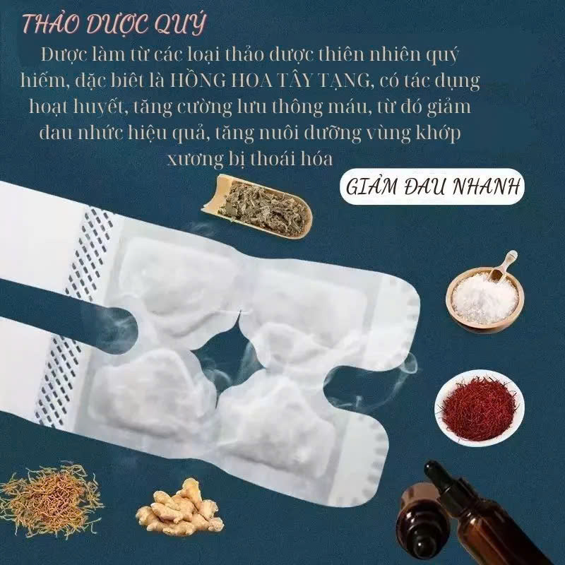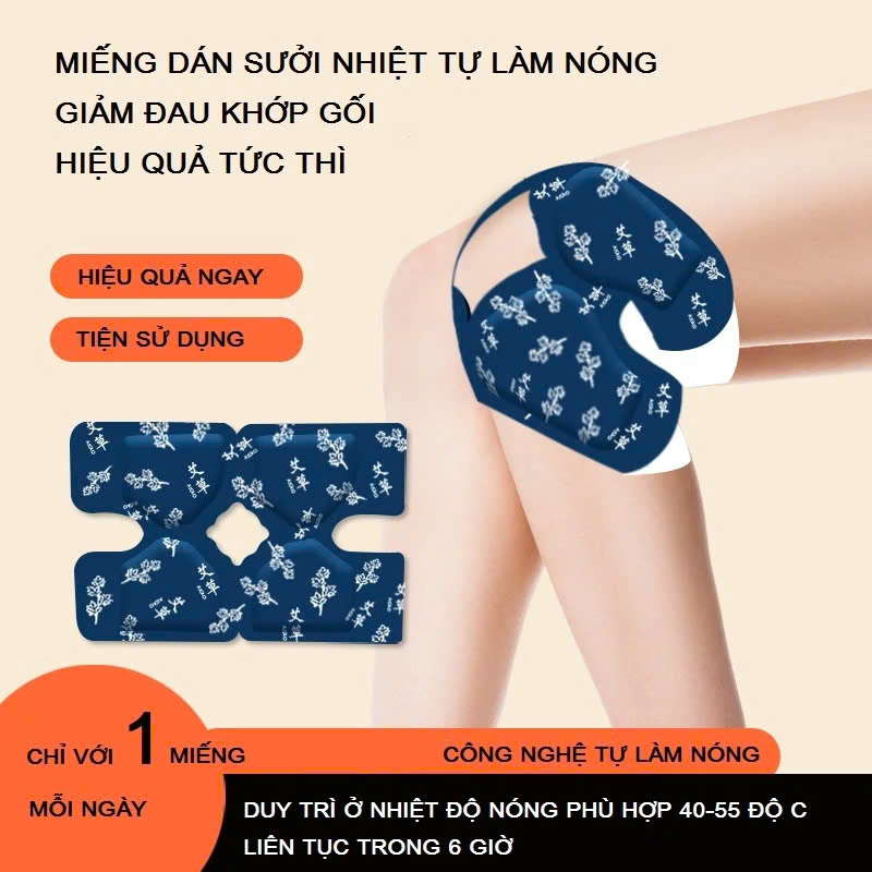 Mua tại TiktokMIẾNG DÁN NHIỆT THẢO DƯỢC GIẢM ĐAU KHỚP GỐI CÔNG DỤNG: Giảm đau, làm ấm vùng khớp gối, hoạt huyết thông kinh lạc, từ đó tăng cường lưu thông máu và các chất dinh dưỡng đến vùng khớp gối, làm chắc xương khớp, giảm đau nhức do thoái hóa khớp, loãng xương, chấn thương, viêm, tràn dịch khớp gối... gây nên. Thành phần thảo dược lành tính, không gây kích ứng da, không gây đỏ và ngứa da, dùng đơn giản, không bị bong khi vận động sinh hoạt THÀNH PHẦN: bao gồm các loại thảo dược