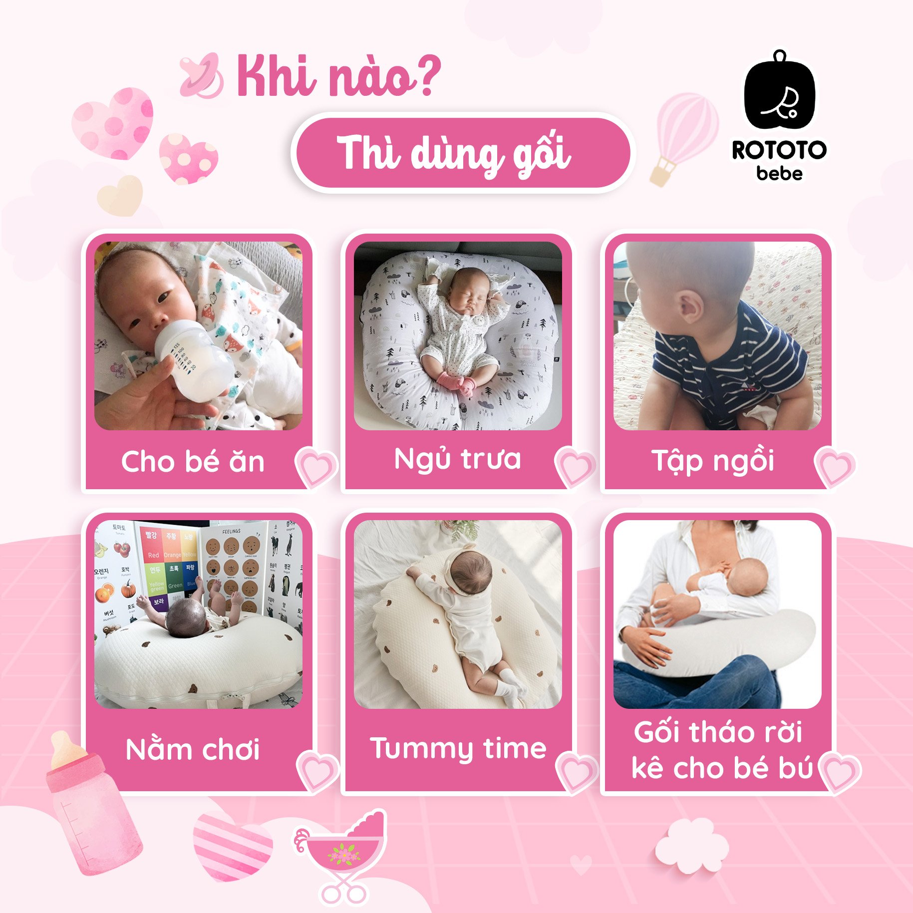 Khi đặt bé nằm trên gối Rototo sẽ giúp duy trì tư thế bế vác là tư thế nhằm hỗ trợ việc ợ hơi của trẻ. Tư thế bế vác này giúp cải thiện chức năng ruột và tiêu hóa, giúp xương cột sống khỏe mạnh.Ngoài ra, thiết kế gối giúp tạo tư thế giống với tư thế khi bé nằm trong tử cung của mẹ nên bé sẽ rất thoải mái.