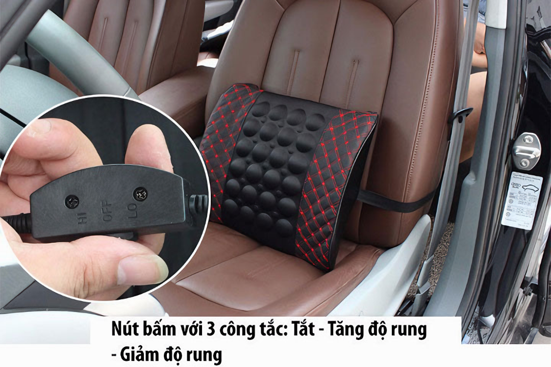 Sử dụng đơn giản: mở khóa mặt sau gối, cắm dây vào đầu tẩu điện 12v trên xe con rồi bấm nút cho đệm rung.