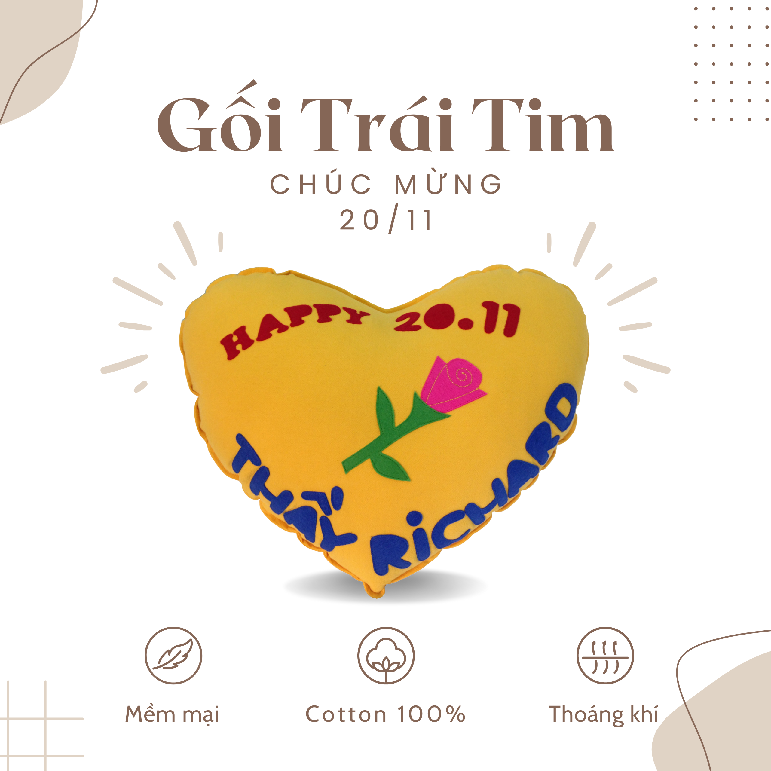 - Thiết kế độc đáo: Gối tựa lưng hình trái tim có kích thước vừa phải, phù hợp để sử dụng ở nhiều không gian khác nhau. Bạn có thể sử dụng gối để tựa lưng khi ngồi đọc sách, xem tivi, hoặc nghỉ ngơi. Với khả năng đắp tên theo yêu cầu, gối trở thành món quà ý nghĩa và cá nhân hóa dành tặng cho người thân, bạn bè trong các dịp đặc biệt như sinh nhật, lễ tình nhân hay ngày kỷ niệm.