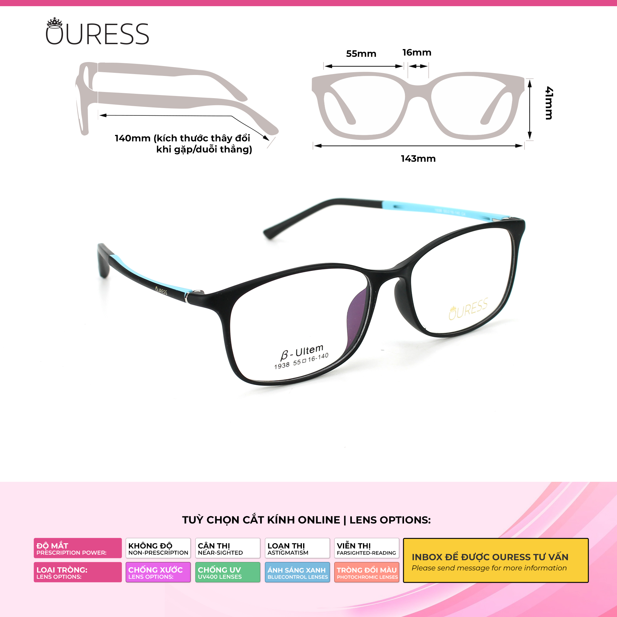Nhựa Ultem là một trong những chất liệu nổi tiếng trong ngành kính. Đây là nhựa vô định hình với độ bền và độ cứng cơ học cao. Chúng có đầy đủ các đặc tính nhiệt học, kỹ thuật và hoá học ưu việt nên vượt trội trong tất cả các loại. • Gọng kính Ultem có đặc tính siêu nhẹ,độ dẻo dai cao và đàn hồi cực tốt. Nó có thể chịu áp lực nhiệt độ cao, và chịu ma sát tốt • Gọng Ultem không dễ bị biến dạng nên dùng được bền lâu, đặc biệt không gây kích ứng da nên rất an toàn khi sử dụng. • Mẫu mã và kiểu dáng đa dạng, lạ mắt, độc đáo. • Gọng kính được thiết kế nhiều màu sắc tạo nên sự trẻ trung và nhiều sự lựa chọn cho người mang. • Gọng kính thích hợp với nhiều dáng mặt khác nhau, và không kén chọn độ tuổi • Gọng kính lắp được tất cả các loại tròng: cận /viễn / loạn/ lão, với nhiều số độ khác nhau —-------------------------------------- HƯỚNG DẪN CÁCH ĐỌC THÔNG SỐ GỌNG KÍNH Thông thường, nhà sản xuất sẽ in thông số trên tròng kính hoặc càng kính để người dùng hình dung về các kích thước của gọng kính. Ví dụ, trên tròng kính bạn thấy một dãy số: 1938 55-16-140 • 1938: là mã gọng kính • 55: ngang khung tròng kính là 55mm • 16 : cầu mũi là 16 mm • 140 : chiều dài càng kính 140mm •Cao kính : 41 mm •Chiều ngang tổng thể gọng kính: 143 mm ++ Mã này là size kính dành cho gương mặt vừa và to vừa . *** tỷ lệ chênh lệch thông số +/- 2mm. Qúy khách có thể liện hệ shop để được tư vấn chọn gọng kính phù hợp với size gương mặt mình nhé vì đây chỉ là thông số tham khảo —-------------------------------------- Bộ phụ kiện đi kèm theo Kính Ouress gồm: -Khăn lau kính và hộp đựng kính ( bộ phụ kiện này không áp dụng cho những sản phẩm sale trên 40% )