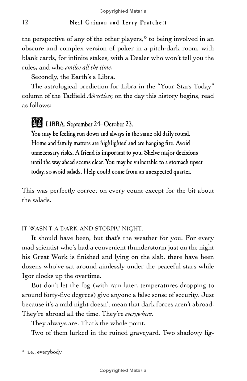 So the armies of Good and Evil are amassing, Atlantis is rising, frogs are falling, tempers are flaring. Everything appears to be going according to Divine Plan. Except a somewhat fussy angel and a fast-living demon—both of whom have lived amongst Earth's mortals since The Beginning and have grown rather fond of the lifestyle—are not actually looking forward to the coming Rapture.