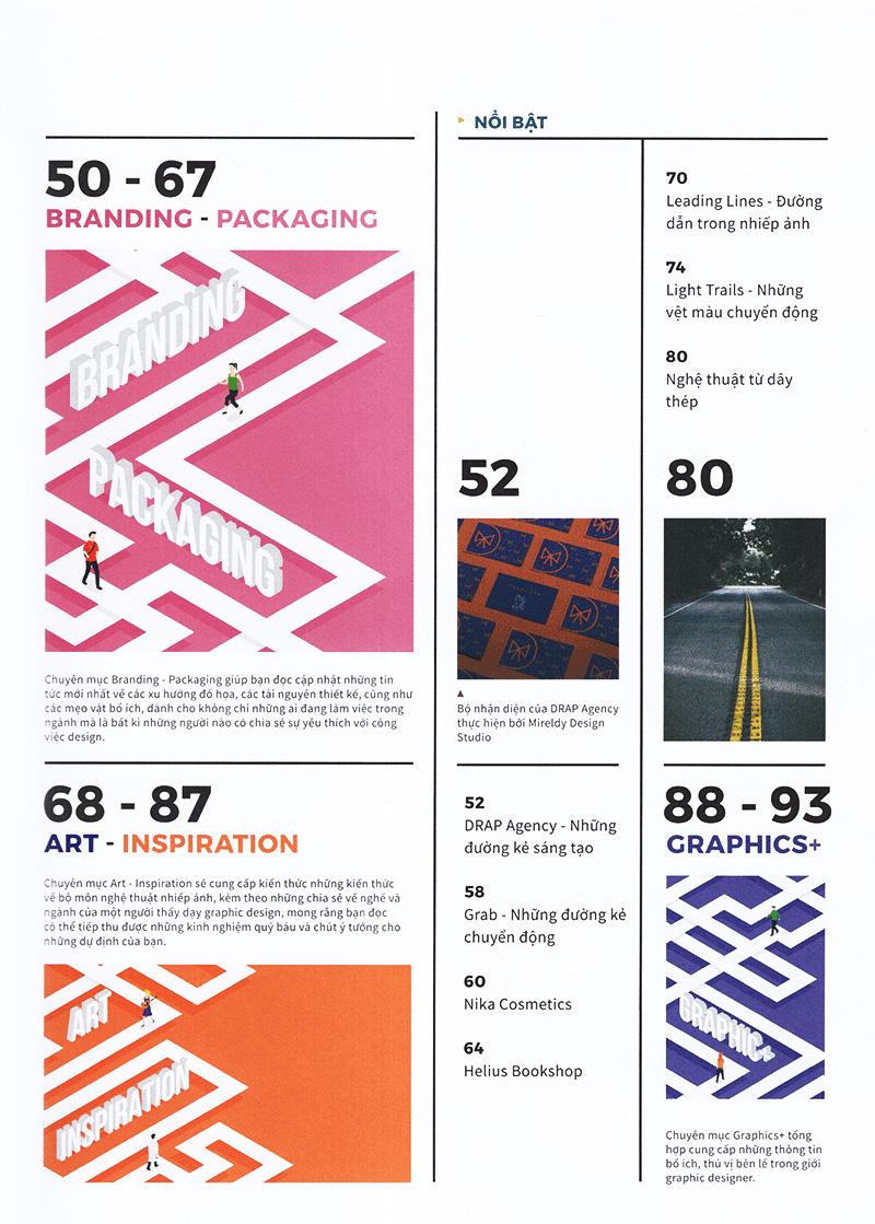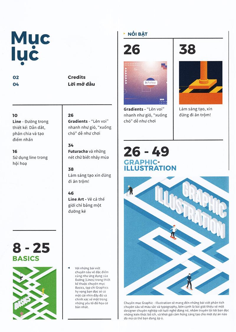 Số thứ hai của Graphics xoay quanh thành phần thiết kế cơ bản thứ hai: Line (đường). Những bài viết chuyên đề sẽ cung cấp cho bạn những khái niệm về Đường và chúng được sử dụng trong những bản thiết kế ra sao. Bên cạnh đó, chuyên mục Graphic - Illustration sẽ phân tích những xu hướng thiết kế nổi bật trong những năm vừa qua như Gradient và Line Art. Chuyên mục Branding - Packaging là tập hợp một số case study về các thương hiệu ứng dụng Line vào nhận diện và bao bì trên thực tế. Ngoài ra, nếu bạn quan tâm tới nhiếp ảnh hoặc muốn tìm kiếm những ý tưởng mới, chuyên mục Art & Inspiration sẽ giới thiệu loạt bài viết và trưng bày những tác phẩm nghệ thuật truyền cảm hứng dành cho bạn.