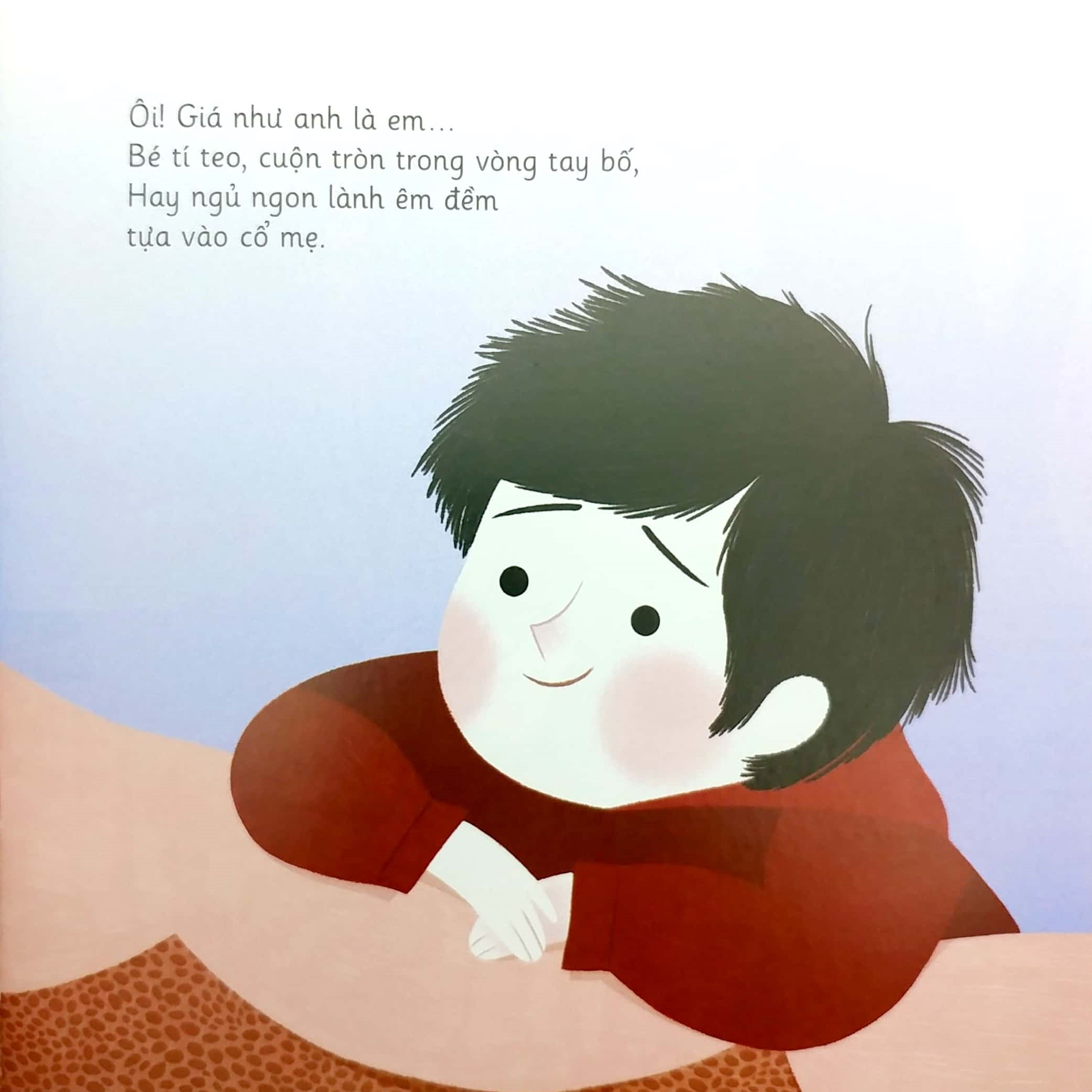 - “Ôi! Giá như anh là Bé tí teo, cuộn tròn trong vòng tay bố. Một lần nữa, bước những bước đầu đời và vỡ òa trong những tiếng reo ” Một câu chuyện tuyệt đẹp để minh họa cho tình yêu thương mà những người anh, người chị dành cho các em nhỏ, và để gửi gắm tất cả sự dịu dàng, niềm ao ước mà các bạn nhỏ muốn gửi tới những người em của mình.