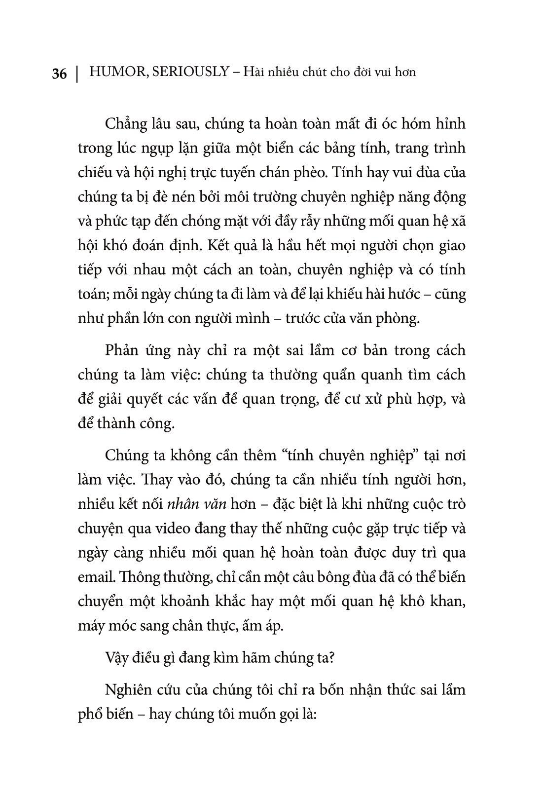 Hài Nhiều Chút Cho Đời Vui Hơn - Humor, Seriously “Cuốn sách có thể không biến bạn thành diễn viên hài nổi tiếng, nhưng nó sẽ mở toang tấm màn để bạn có thể hiểu được cách họ suy nghĩ, đồng thời hướng dẫn bạn một số phương thức gây cười mới”. Hài hước giúp chúng ta “người” hơn Nếu vắng bóng sự hài hước, rất khó để nói về một điều gì đó sâu sắc và ý nghĩa. Nếu thiếu vắng sự hài hước, tất cả đều trở nên quá hiển nhiên, quá rõ ràng. Câu chuyện không chạm được tới khán giả; nó không khác gì những bài giảng. Hài hước không phải là những câu pha trò hay hành động đùa giỡn xuất hiện tùy ý – nó phải nảy sinh tự nhiên từ chính các nhân vật. Không gian và chất liệu tạo ra sự hài hước trong diễn biến của một bộ phim, hoặc sự chuyển hóa của một nhân vật, là thứ tạo ra ý nghĩa cho khán giả. Đó cũng chính là cách cuộc sống vận hành. Tất cả chúng ta đều muốn đời m.ình có ý nghĩa. Tuy nhiên, có những thời điểm mà công việc và cuộc sống trở nên nặng nề và khó khăn, buồn tẻ và căng thẳng. Và sự hài hước không chỉ giúp chấm dứt và trung hòa sự nghiêm trọng – nó còn cho phép ý nghĩa hiện hình. Những khoảnh khắc bất ngờ với đồng nghiệp, đối tác, gia đình và bạn bè sẽ khuấy động mọi thứ và khiến bạn trở nên tỉnh táo. Giống như những khoảnh khắc khó khăn, những khoảnh khắc bất ngờ này định hình mối quan hệ của bạn. Vui đùa và gắn bó với người khác trong những thời khắc tốt lành có giá trị lớn lao trong thời điểm mọi thứ trở nên trầm trọng. Khiếu hài hước giúp chúng ta “con người” hơn. Nó có khả năng kết nối sâu sắc và truyền sức mạnh. Vận dụng nó không có nghĩa là xem nhẹ những thứ nghiêm túc, mà nghĩa là bạn có thể tiến về phía trước, bất chấp những thứ nghiêm túc đó. Hài nhiều chút cho đời vui hơn Qua đó, quyển sách Hài nhiều chút cho đời vui hơn sẽ giúp bạn tìm thấy khoảnh khắc “à há” của chính bạn. Bạn sẽ tìm hiểu các công cụ để đưa hài hước vào những thời khắc lớn, quan trọng, và cả những khoảnh khắc thường nhật nữa. Dù bạn đang thuyết trình ý tưởng cho nhóm làm việc hay mua trái cây ở cửa hàng trong sân bay – một câu bông đùa có thể biến đổi cuộc trò chuyện, tạo dựng kết nối và báo hiệu bạn đang thấy người kia. Hơn nữa, cuốn sách HUMOR, SERIOUSLY: Why Humor Is a Secret Weapon in Business and Life này cũng đính chính, bóc tách lợi ích của óc hài hước đối với sự nghiệp, công ty và cuộc sống chúng ta bằng cách sử dụng cách thức quyến rũ nhất trong giới học thuật: khoa học hành vi (cùng với rất nhiều sự giúp đỡ từ các diễn viên hài và lãnh đạo của doanh nghiệp). Bạn sẽ biết được vì sao khiếu hài hước lại quyền năng đến thế, vì sao nó lại được sử dụng chưa đúng mức và – quan trọng nhất – hướng dẫn cách để bạn sử dụng sự hài hước nhiều hơn, tốt hơn. Bằng cách hiểu khoa học, cơ học và các ứng dụng của hài hước (trong não bộ, trong doanh nghiệp và trong cuộc sống), chúng ta có thể thay đổi cách m.ình nhìn thế giới và cách nó nhìn lại m.ình.