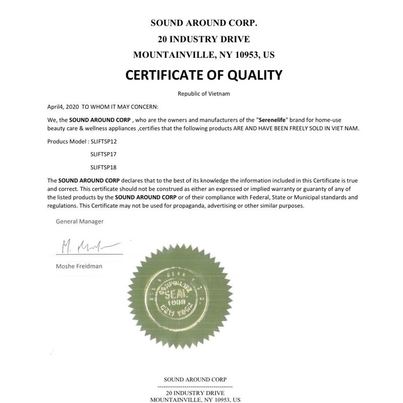 Sản phẩm của SereneLife đạt đầy đủ các chứng nhận chất lượng khắt khe nhất trên toàn thế giới.