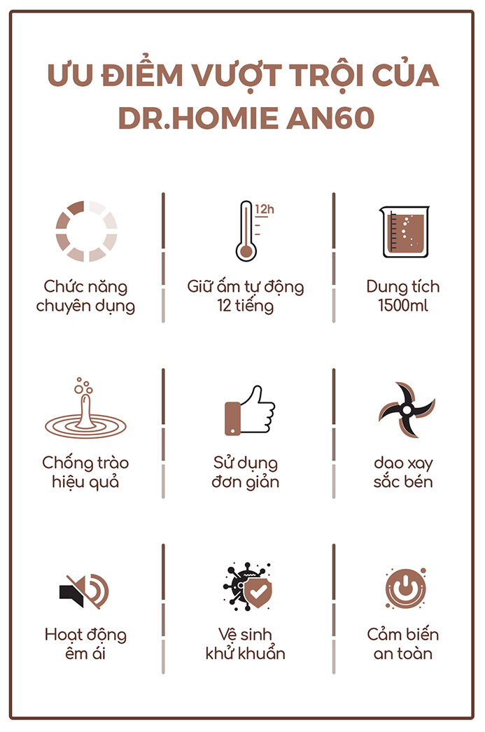 Không chỉ giúp khách hàng tự tạo ra những ly sữa thơm ngon và bổ dưỡng với ít công sức. Drhomie AN60 còn được trang bị các chức năng đặc biệt như nấu cháo hạt, xay sinh tố, giữ ấm, sữa lắc giúp người dùng có thể tự do sáng tạo, giúp giảm bớt thời gian nấu nướng nhưng vẫn đảm bảo được dinh dưỡng cho cả gia đình.