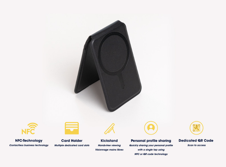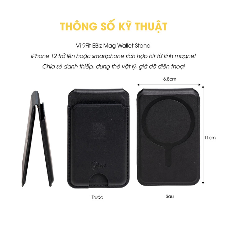 Ví 9Fit EBiz Mag Wallet Stand, Ví da hít từ tính Magnetic kiêm chân đến xoay 360 độ tích hợp công nghệ NFC - Chính hãng Tính năng: Ví da EBiz tích hợp công nghệ NFC, dễ dàng chia sẻ hồ sơ cá nhân, trao đổi danh thiếp điện tử chỉ với một chạm Danh thiếp NFC, tích hợp app quản lý, hỗ trợ trao đổi thông tin cá nhân nhanh chóng dễ dàng Mã QR chuyên dụng kèm e-contact người dùng, một quét để truy cập ngay Tích hợp hít từ tính Magnetic, gắn trực tiếp vào điện thoại và/hoặc ốp lưng điện thoại có nam châm Bổ sung 3 ngăn đựng thẻ vật lý chuyên dụng Chân đế tích hợp hỗ trợ rảnh tay thực hiện nhiều công việc khác (theo chiều ngang hoặc xoay 360 độ) Thông số kỹ thuật: Chất liệu: Da PU cao cấp + Vòng nam châm Gắn trực tiếp vào điện thoại và/hoặc ốp lưng điện thoại có nam châm Danh thiếp NFC tích hợp app quản lý Mã QR cá nhân kèm e-contact của người dùng Chân đế tích hợp dựng đứng điện thoại Chính sách bảo hành: Không bảo hành hình thức và vấn đề phát sinh tự nhiên trong quá trình sử dụng (Ví dụ ví da bỉ xỉn màu hoặc mềm đi...)