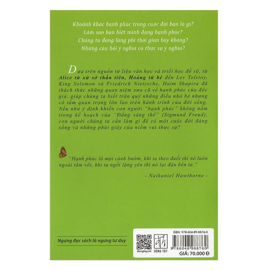 Mua tại TiktokDựa trên nguồn tư liệu văn học và triết học đồ sổ , từ alice từ xứ sở thần tiên , hoàng tử bé đến Lev Tolstoy , King Solomon và Friedrich Nietzshe , Haim Shapira đã thách thức những quan niệm xưa cũ về hạnh phúc của độc giả , giúp chúng ta biết quý những điều nhỏ bé nhưng có tầm quan trọng lớn lao trên hành trình của đời sống