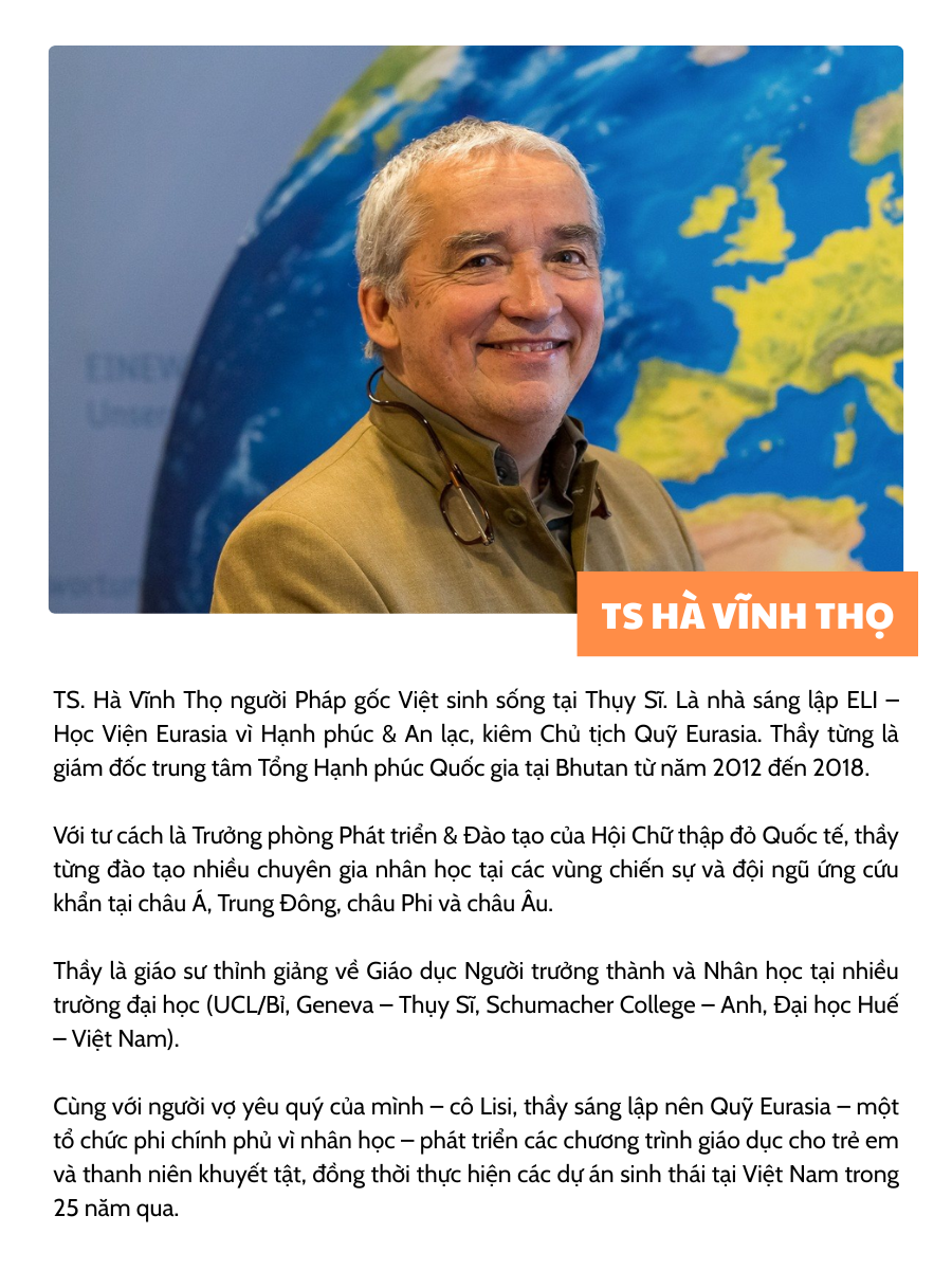 TS. Hà Vĩnh Thọ người Pháp gốc Việt sinh sống tại Thụy Sĩ. Là nhà sáng lập ELI – Học Viện Eurasia vì Hạnh phúc & An lạc, kiêm Chủ tịch Quỹ Eurasia. Thầy từng là giám đốc trung tâm Tổng Hạnh phúc Quốc gia tại Bhutan từ năm 2012 đến 2018.