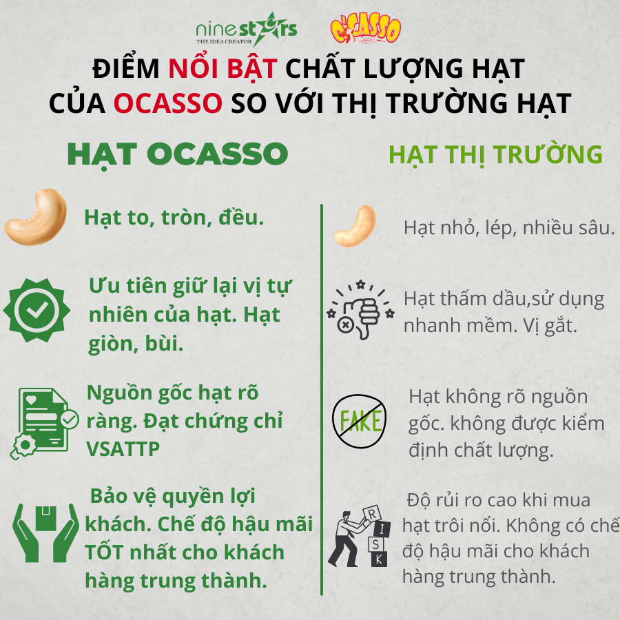 Nine Stars đã nghiên cứu rất kỹ nguyên liệu hạt điều trước khi cho chế biến. Mỗi loại điều, giống điều hay vùng trồng cũng cho ra chất lượng hạt điều khác nhau, nên việc am hiểu nguyên liệu hạt điều là điều kiện rất cần thiết cho sản phẩm chế biến hạt điều nguyên. Sản phẩm hạt điều lụa rang muối loại cồ O’Casso có độ chắc hạt, to mẩy, béo thơm, giòn tan, cực kỳ dễ bóc vỏ.