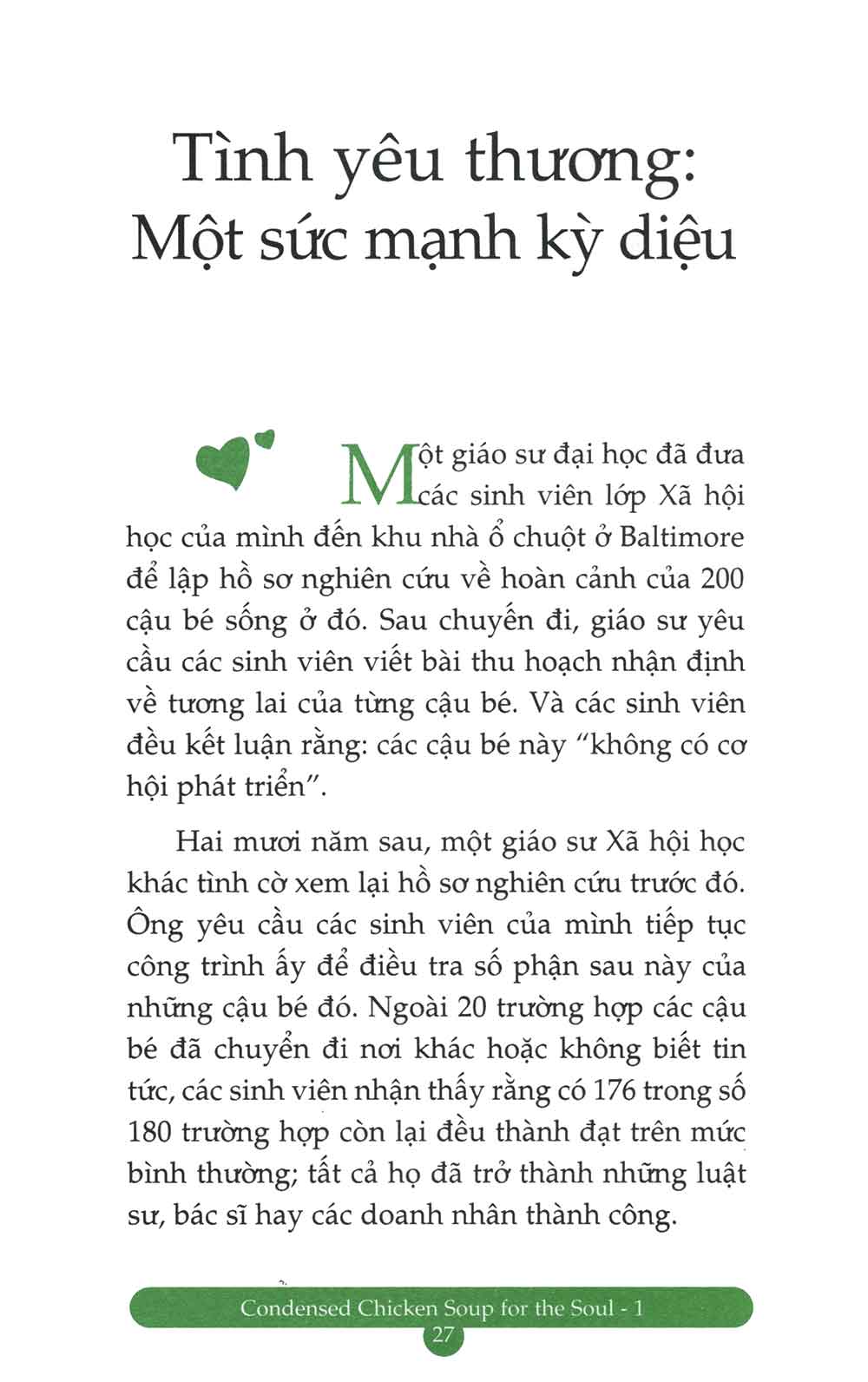Chicken Soup for the Soul đã trở thành một thương hiệu lớn có giá trị không chỉ về mặt thương mại mà còn ở tính nhân văn cao đẹp. Những câu chuyện về tình yêu thương, về sự quan tâm của cha mẹ, về sự trải nghiệm khám phá và học hỏi trong bộ sách này sẽ khơi dậy khát vọng trong bạn, thôi thúc bạn dang rộng cánh tay chia sẻ đầy yêu thương với bạn bè và người thân, sẽ là niềm an ủi, xoa dịu những khi bạn căng thẳng tinh thần, sẽ làm bạn bừng sáng với những thời khắc của sự vượt lên chính mình và thức tỉnh cảm nhận. Chúng sẽ khuyến khích bạn kiên trì nuôi dưỡng, dám sống với ước mơ, sẵn sàng vượt qua những khó khăn, thử thách mà bạn chắc chắn sẽ gặp phải trên cuộc hành trình biến ước mơ thành hiện thực. Mỗi câu chuyện là một thông điệp có thể hàn gắn vết thương, làm thay đổi suy nghĩ, tâm hồn và đôi lúc, cả cuộc đời bạn.”