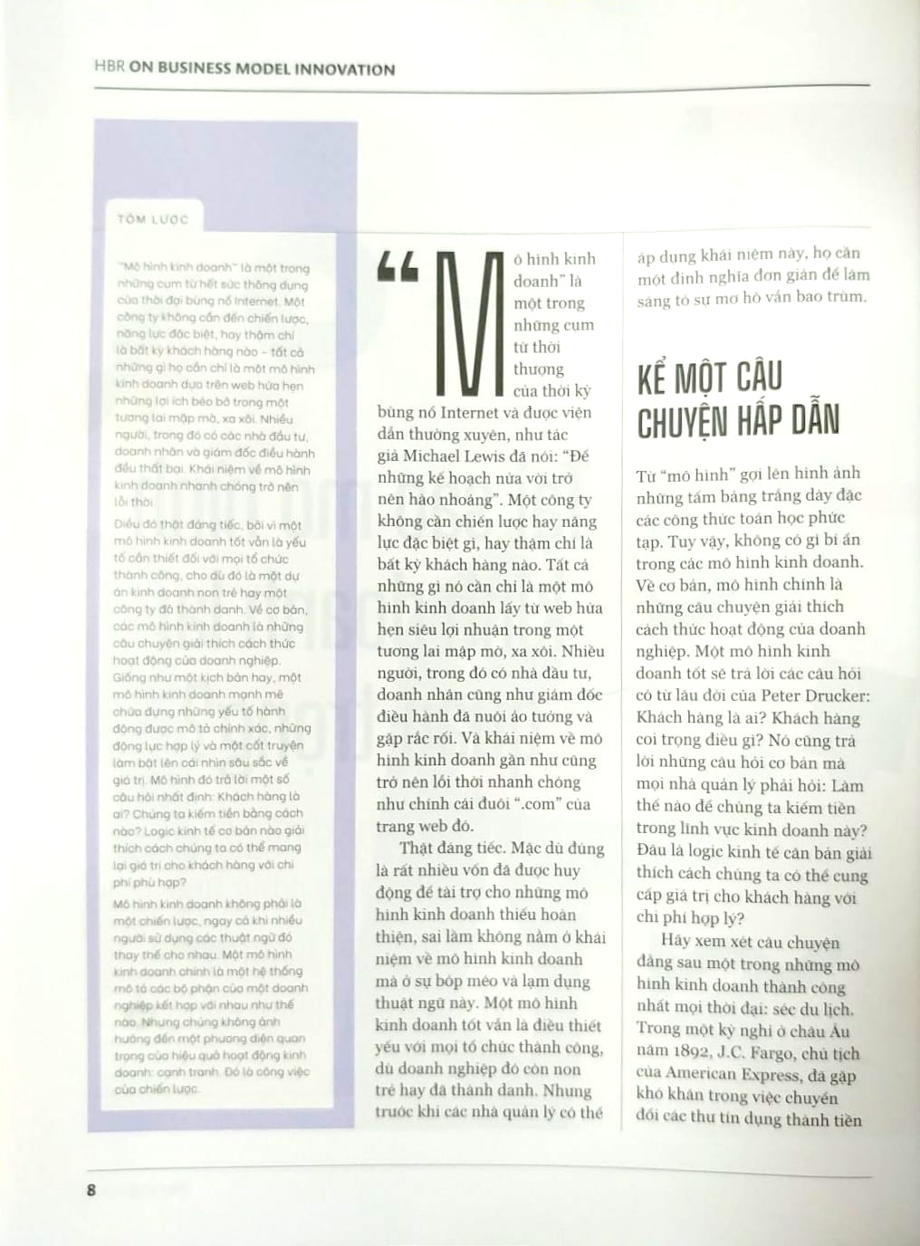 Ấn phẩm bao gồm 11 bài viết xuất sắc nhất về đổi mới mô hình kinh doanh để giúp bạn tiếp cận khách hàng mới và đi trước đối thủ. Bạn sẽ được truyền cảm hứng để: đánh giá xem mô hình kinh doanh cốt lõi của mình đang “khỏe mạnh” hay suy yếu; đẩy lùi các đối thủ mới gia nhập thị trường chuyên cung cấp sản phẩm miễn phí và giảm giá sâu; thúc đẩy tăng trưởng mạnh mẽ bằng cách bổ sung thêm một mô hình kinh doanh thứ hai; học hỏi bí quyết của các công ty khởi nghiệp tinh gọn; phát triển một nền tảng xoay xung quanh các sản phẩm chủ chốt; biến đổi mới mô hình kinh doanh trở thành một nguyên tắc được áp dụng thường xuyên trong công ty.