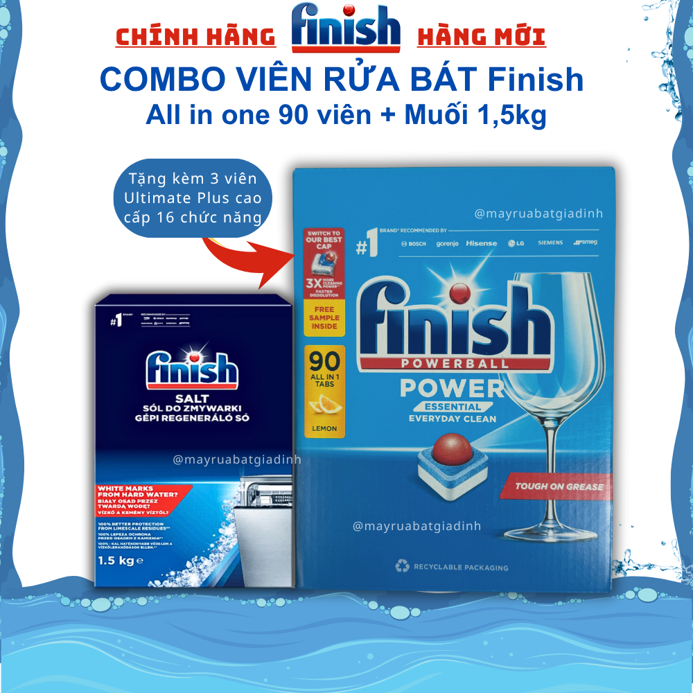 Combo: Viên rửa bát Finish 110 viên + Muối rửa bát Finish 1.5kg Chuyên dùng cho máy rửa bát chén giúp bát rửa sạch chống đóng cặn ở máy, các ly, cốc thủy tinh không