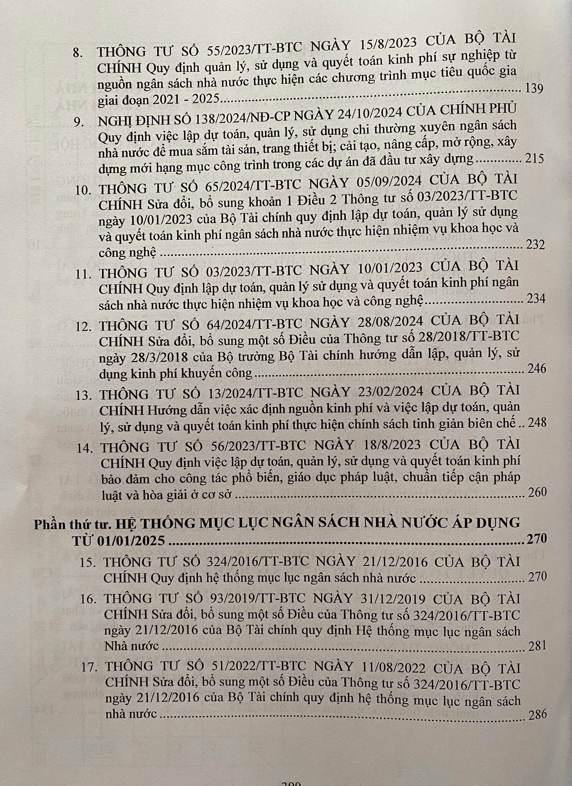 Ngày 26/11/2024, Bộ Tài chính ban hành Thông tư 84/2024/TT-BTC sửa đổi, bổ sung một số điều của Thông tư 324/2016/TT-BTC ngày 21/12/2016 quy định hệ thống mục lục ngân sách Nhà nước đã được sửa đổi, bổ sung tại Thông tư 93/2019/TT-BTC ngày 31/12/2019 và Thông tư 51/2022/TT-BTC ngày 11/08/2022. Mục tiêu chính của việc sửa đối này là cải thiện tính linh hoạt, hiệu quả và phù hợp hơn với các yêu cầu quản lý ngân sách nhà nước trong bối cảnh mới. Một số mã mục, tiểu mục được thay đổi để phù hợp với thực tiễn thu chi ngân sách hiện tại. Ngoài ra, các điều chỉnh nhằm đảm bảo phản ánh đầy đủ và rõ ràng hơn nguồn gốc cũng như mục đích sử dụng ngân sách. Nhằm giúp các cơ quan, đơn vị nắm bắt kịp thời và thực hiện tốt việc quản lý tài chính, lập dự toán, thanh quyết toán thu chi ngân sách nhà nước Nhà xuất bản Tài Chính xuất bản và phát hành cuốn sách: HỆ THỐNG MỤC LỤC NGÂN SÁCH NHÀ NƯỚC (Sửa đổi, bổ sung) Nội dung cuốn sách gồm các phần chính sau: Phần thứ nhất. HƯỚNG DẪN XÂY DỰNG DỰ TOÁN NGÂN SÁCH NHÀ NƯỚC NĂM 2025 VÀ KẾ HOẠCH TÀI CHÍNH - NGÂN SÁCH NHÀ NƯỚC 03 NĂM 2025 - 2027. Phần thứ hai. HƯỚNG DẪN THỰC HIỆN CHẾ ĐỘ QUẢN LÝ, TÍNH HAO MÒN TÀI SẢN CỐ ĐỊNH. Phần thứ ba. QUY ĐỊNH VIỆC LẬP DỰ TOÁN, QUẢN LÝ SỬ DỤNG VÀ QUYẾT TOÁN KINH PHÍ NGÂN SÁCH NHÀ NƯỚC. Phần thứ tư. HỆ THỐNG MỤC LỤC NGÂN SÁCH NHÀ NƯỚC ÁP DỤNG TỪ 01/01/2025 Luatvietbook xin trân trọng giới thiệu cuốn sách đến bạn đọc!