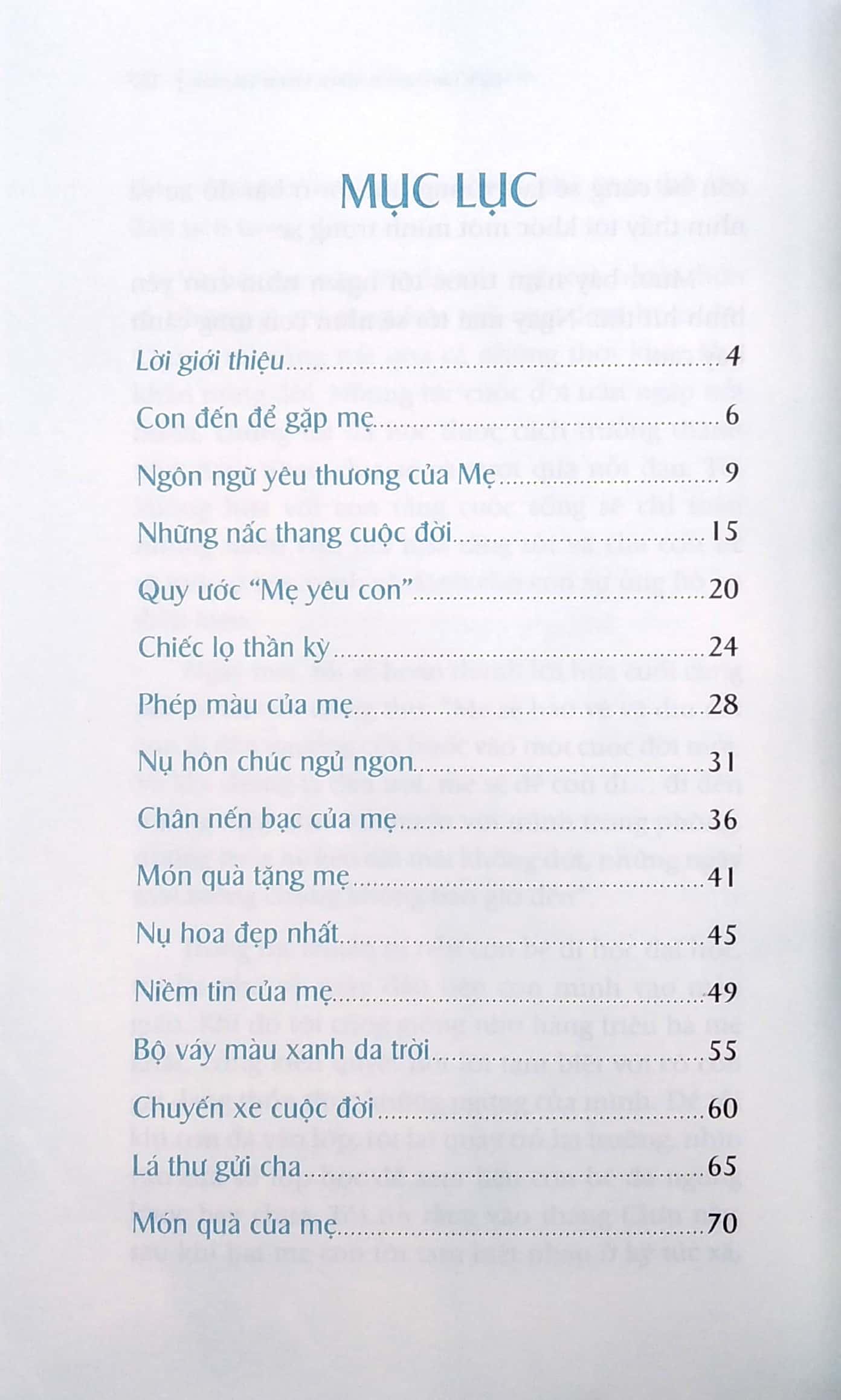 Trong những trang sách, bạn sẽ tìm lại được những phút giây đồng cảm trong tình yêu thương, cảm xúc về Mẹ, tìm về ký ức tuổi thơ thân thương gắn bó bên Mẹ, và cả về lỗi lầm, những suy tư trăn trở, về tất cả những gì Mẹ đã hy sinh cho chúng ta. Chúng ta hãy cùng đọc để suy nghĩ và dành những gì sâu sắc nhất cho Mẹ – người đã tạo ra chúng ta, đã từng, đang và sẽ mãi yêu thương chúng ta đến cuối cuộc đời.