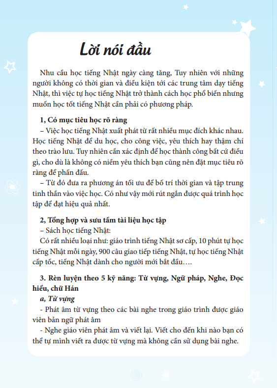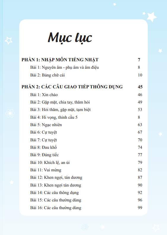 Mỗi phần có một đặc trưng riêng, ngoài ra chúng tôi còn có đĩa CD phối kèm với giọng đọc của người bản xứ giúp bạn quen với ngữ điệu của người Nhật. Trong quá trình biên soạn còn nhiều thiếu sót mong bạn đọc gần xa chỉ bảo và giúp đỡ.