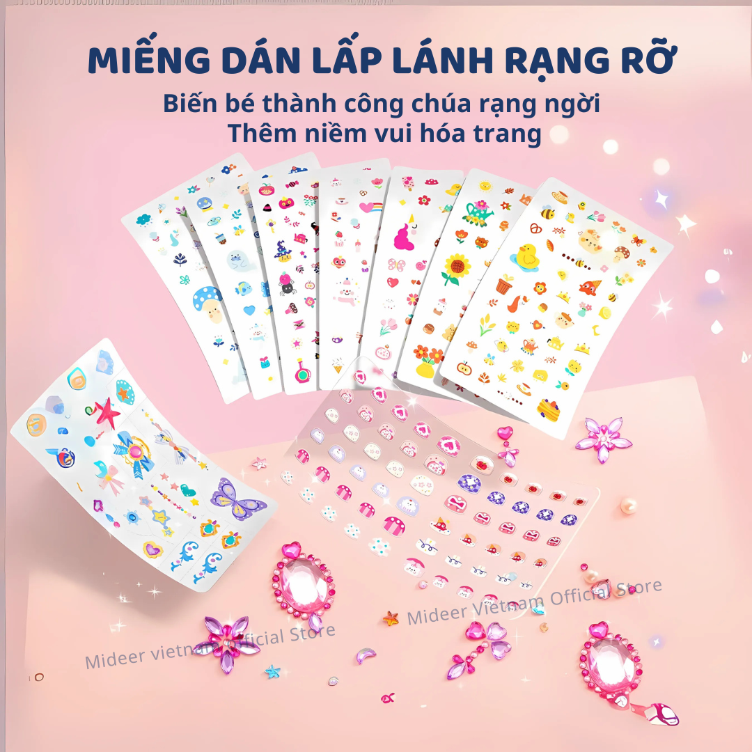 - MIẾNG DÁN LẤP LÁNH: biến bé thành 1 nàng công chúa rạng ngời! Hoàn hảo cho những bé gái yêu thích đồ óng ánh, thêm niềm vui khi hóa trang.