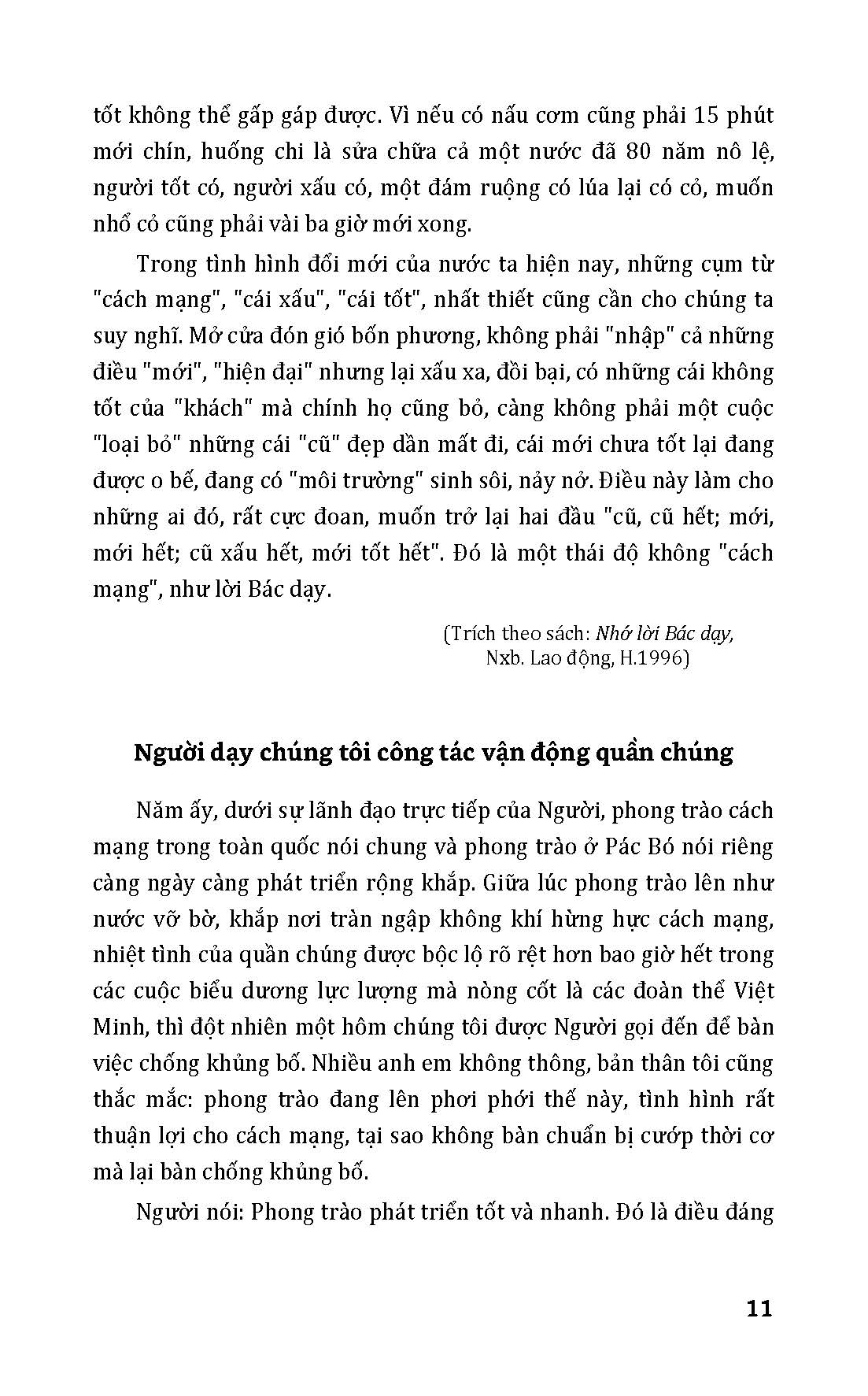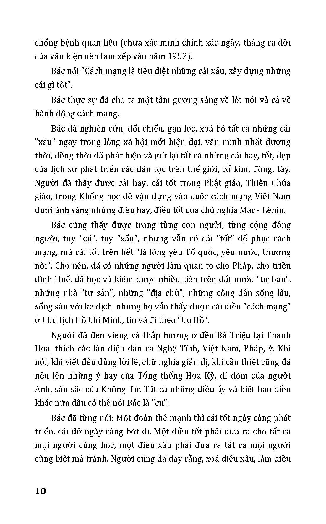 Mua tại TiktokChí khí cách mạng kiên cường, tinh thần độc lập tự chủ, lòng yêu nước, yêu nhân dân tha thiết, cùng đạo đức cần, kiệm, liêm, chính, chí công vô tư, khiêm tốn và giản dị, một trí tuệ anh minh, mẫn tiệp, một tầm nhìn xa rộng, sâu sắc, một mẫu mực tuyệt vời về cách sống, cách nghĩ, cách viết, cách nói, cách làm việc của Chủ tịch Hồ Chí Minh là động lực, nguồn sức mạnh to lớn giúp nhân dân ta phát huy nội lực, vượt qua mọi thách thức, khó khăn giành được những thắng lợi vĩ đại trong sự nghiệp xây dựng và bảo vệ Tổ quốc.