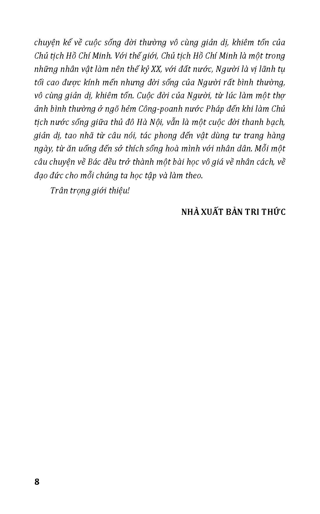 Sách nói về vị lãnh tụ kính yêu của dân tộc dưới góc nhìn gần gũi, thân thương. Mặc dù bám theo trình tự biên niên, sách vẫn cố gắng tổ chức theo các lĩnh