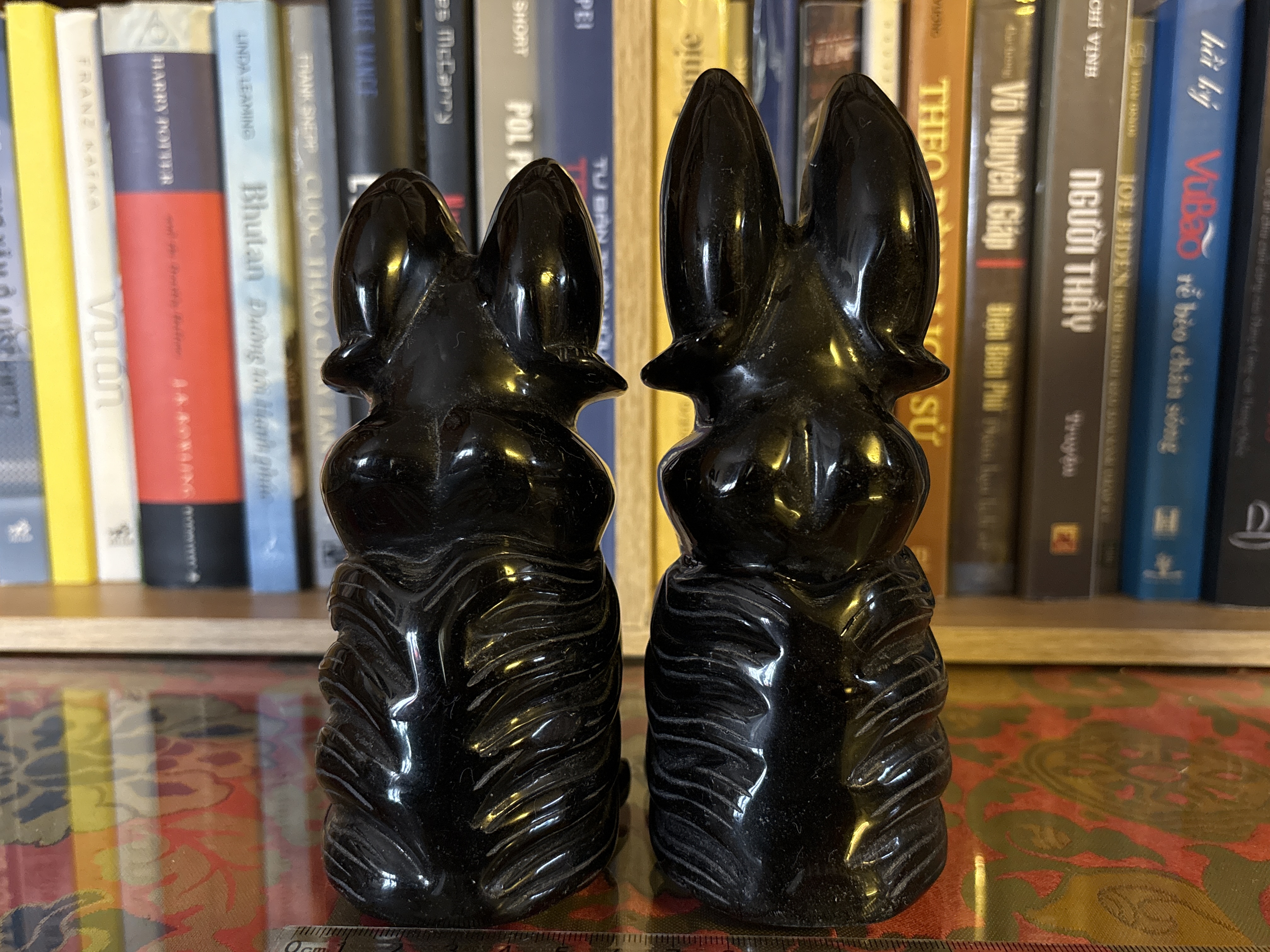 Tượng Hồ ly 9 đuôi chạm khắc tinh sảo bằng đá tự nhiên Obsidian. Kích thước 14cm và 16cm Hồ ly phong thủy - biểu tượng may mắn trong tình yêu Tượng