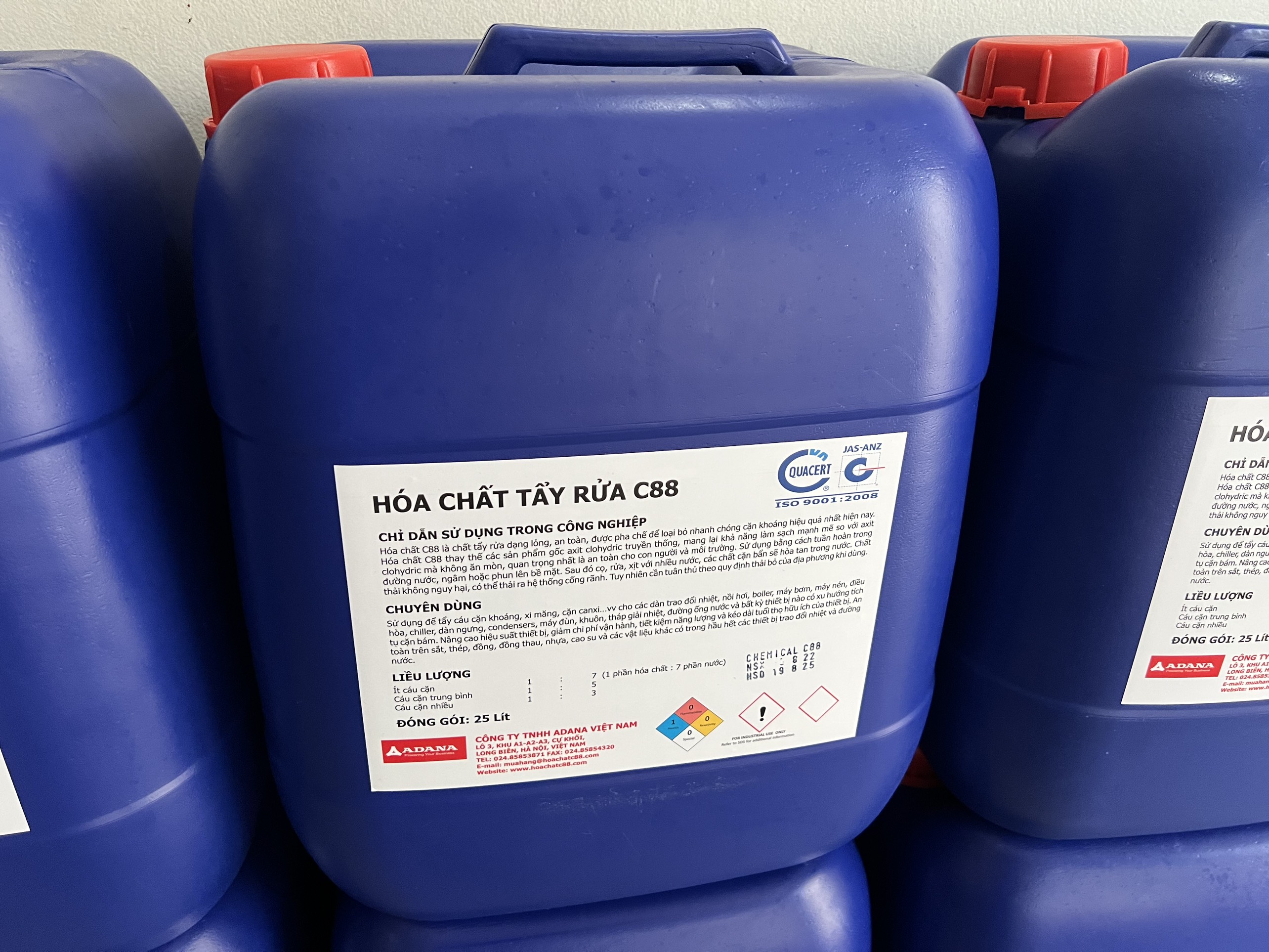 Hóa chất tẩy rửa C88 Nhà cung cấp: ADANA Vietnam Co., Ltd. Sản xuất : Việt Nam Quy cách : Can 25L Cân nặng: 30kg Bảo quản: 3 năm Công dụng của hóa chất tẩy