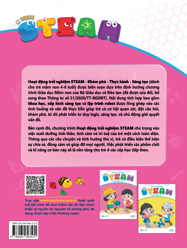 Hoạt động trải nghiệm Steam, Khám phá - thực hành - sáng tạo (dành cho trẻ mầm non 4-6 tuổi) được biên soạn dựa trên định hướng chương trình Giáo dục Mầm non của Bộ Giáo dục và Đào tạo (đã được sửa đổi bổ sung theo Thông tư số 51/2020/TT-BGDĐT) các tình huống và vấn đề thực tiễn, nhằm khuyến khích trẻ quan sát, đặt câu hỏi, khám phá, từ đó phát triển tư duy logic, sáng tạo, và chủ động giải quyết vấn đề.