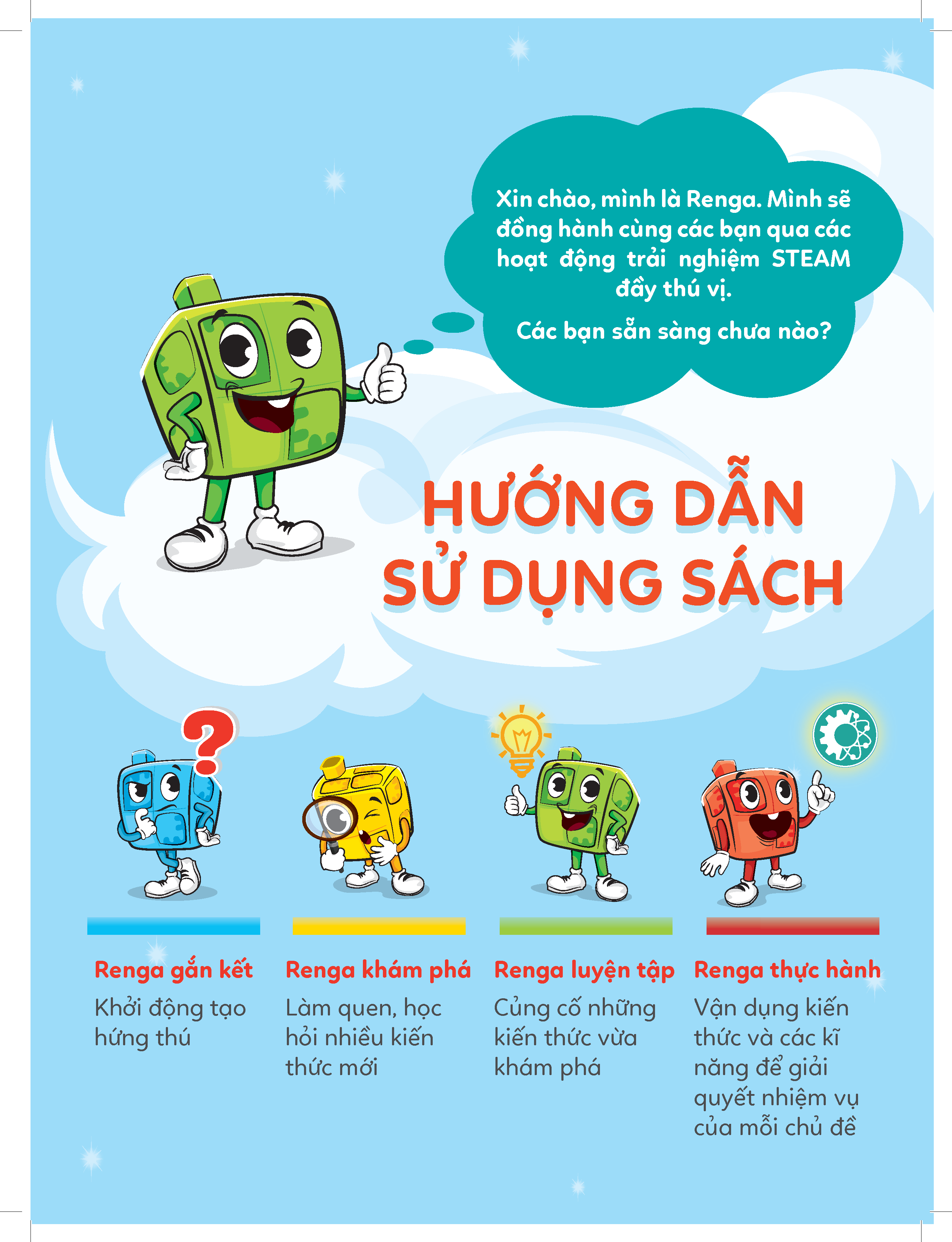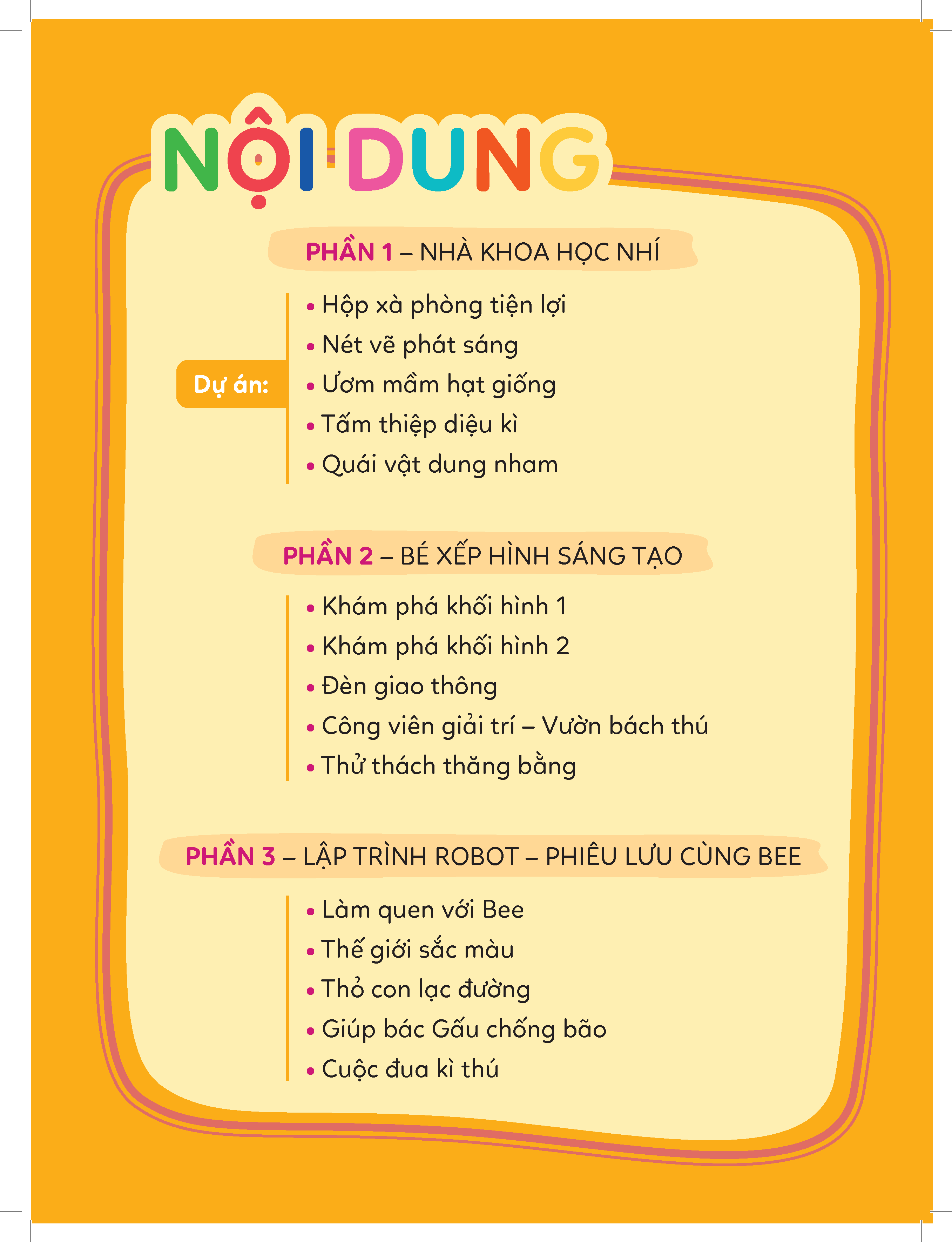 Nội dung tài liệu gồm ba phần chính: Dự án Khoa học, Xếp hình Sáng tạo, và Lập trình robot. Mỗi phần đều được thiết kế dựa trên các tình huống và vấn đề thực tiễn, nhằm khuyến khích trẻ quan sát, đặt câu hỏi, khám phá, từ đó phát triển tư duy logic, sáng tạo, và chủ động giải quyết vấn đề.