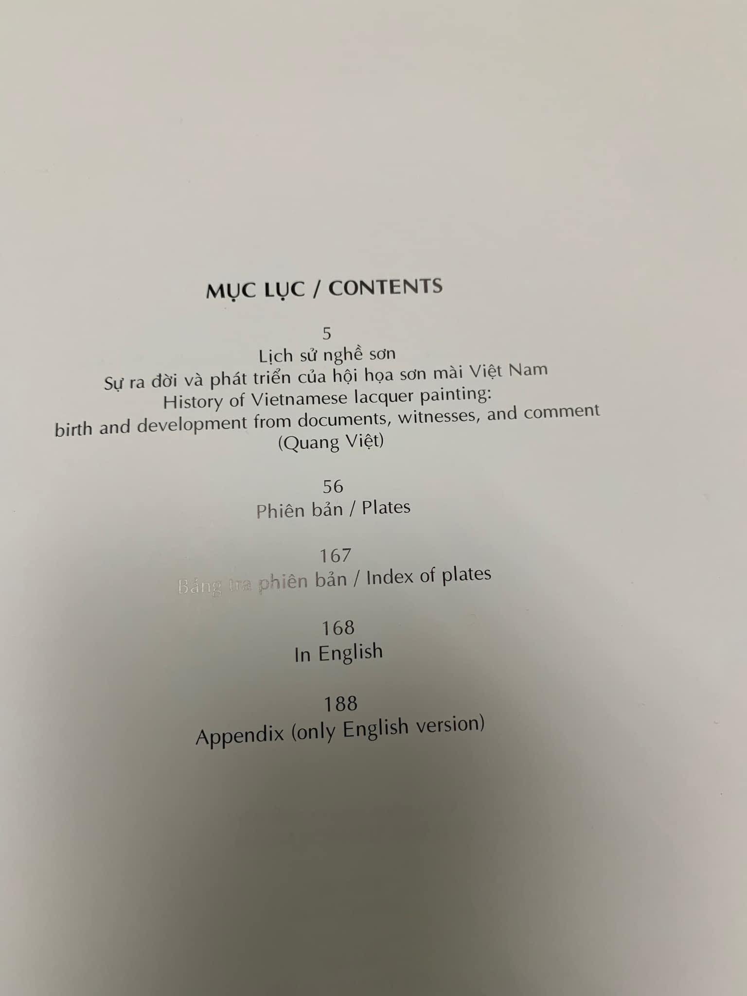 Lịch sử của hội họa trên phương diện kỹ thuật, chính là sự trả lời cho câu hỏi: vẽ trên cái gì và vẽ bằng cái gì? Chất liệu chủ yếu để làm tranh sơn mài Việt Nam cũng chính là cổ chất dùng trong cổ sơn của người Việt Nam. Đó là chất nhựa mủ chích lấy ở vỏ một loại cây có tên gọi là cây sơn. Từ đó suy ra thì sơn mài chính là chất liệu hội họa cực kỳ độc đáo mang tính đặc thù dân tộc của Việt Nam, cho dù đã đạt đến đỉnh cao ở đủ các môn khác, tấm lòng khắc khoải, khát khao của các nghệ sĩ vẫn canh cánh hướng về nó. Tác giả cuốn sách đã dày công tuyển chọn và tổng hợp những tư liệu cơ bản về lịch sử hình thành, quá trình phát triển, những thành tựu nổi bật của hội họa sơn mài Việt Nam. Đồng thời, nội dung chính của sách tập trung giới thiệu những tác phẩm đặc sắc của nhiều họa sĩ: Trần Văn Cẩn, Đỗ Đức Khải, Hoàng Tích Chù, Nguyễn Gia Trí Điểm cốt lõi của các bức tranh là đề cao được không khí Việt Nam, cái đẹp thể hiện tâm lý thời đại, tâm lý dân tộc. Sách in màu đẹp mắt, chất liệu giấy tốt, sáng rõ. Đây là tài liệu hữu ích và ý nghĩa cho những ai muốn tham khảo tìm hiểu thêm về nghệ thuật hội họa sơn mài Việt Nam.