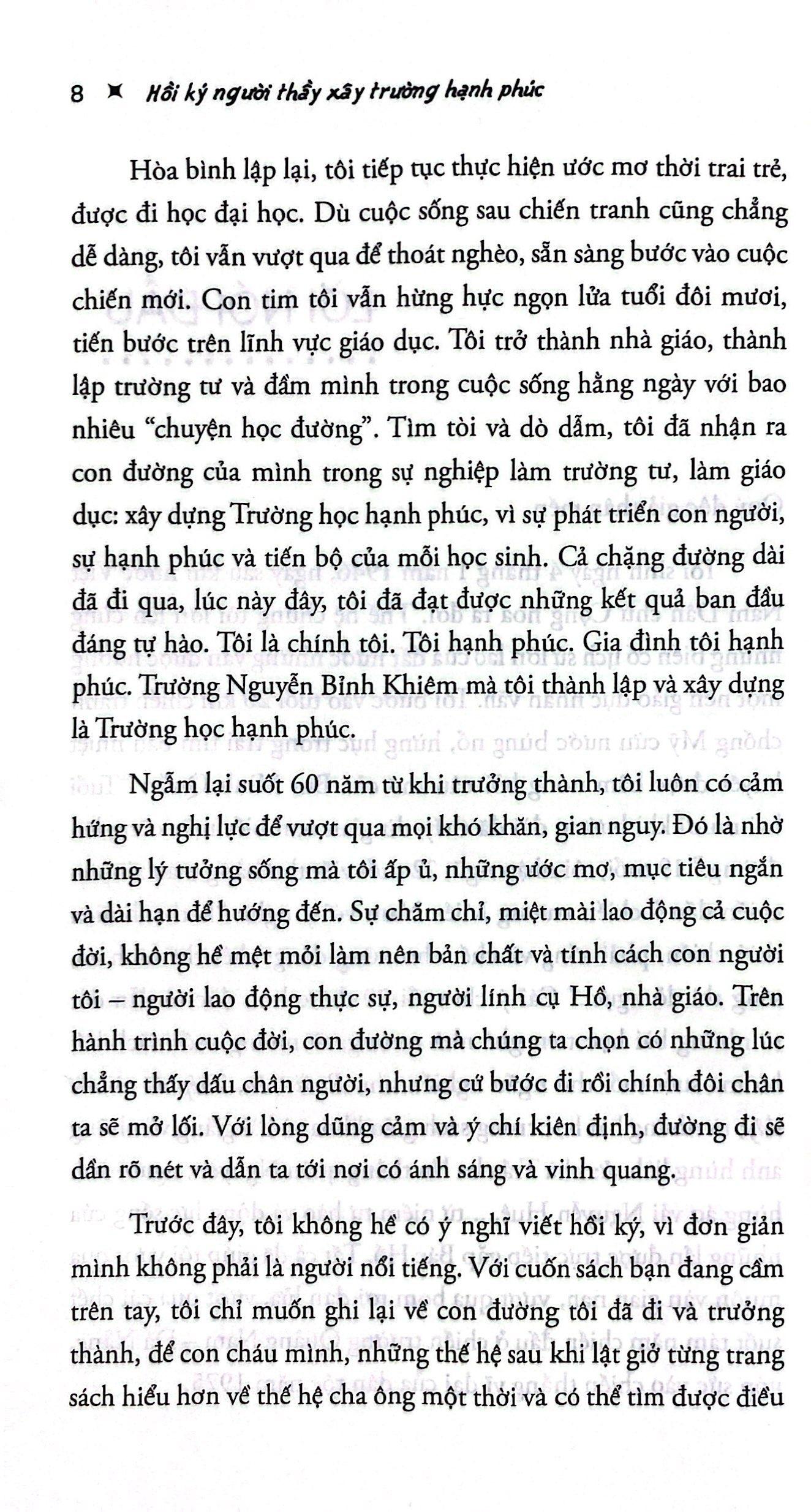 Quãng đời từ khi còn nhỏ, đi bộ đội đến lúc bước vào lĩnh vực giáo dục, thầy gặp khó khăn nhiều vì xuất thân, vì những nghi ngại không đáng có mà bất kỳ ai trong chúng ta hẳn cũng từng gặp phải. Nhưng “sống với tinh thần học tập, phát triển thì ở đâu m.ình cũng thích nghi được”, thầy đã khiến mọi người từ từ chấp nhận, quý mến rồi đến nể phục. Thầy dựa trên những trải nghiệm của bản thân để sáng lập nên ngôi trường mơ ước, một ngôi trường không có cái roi nào cả, một nhà trường phải tiến bộ về cả chỉ số hạnh phúc lẫn điểm số của mỗi học trò.