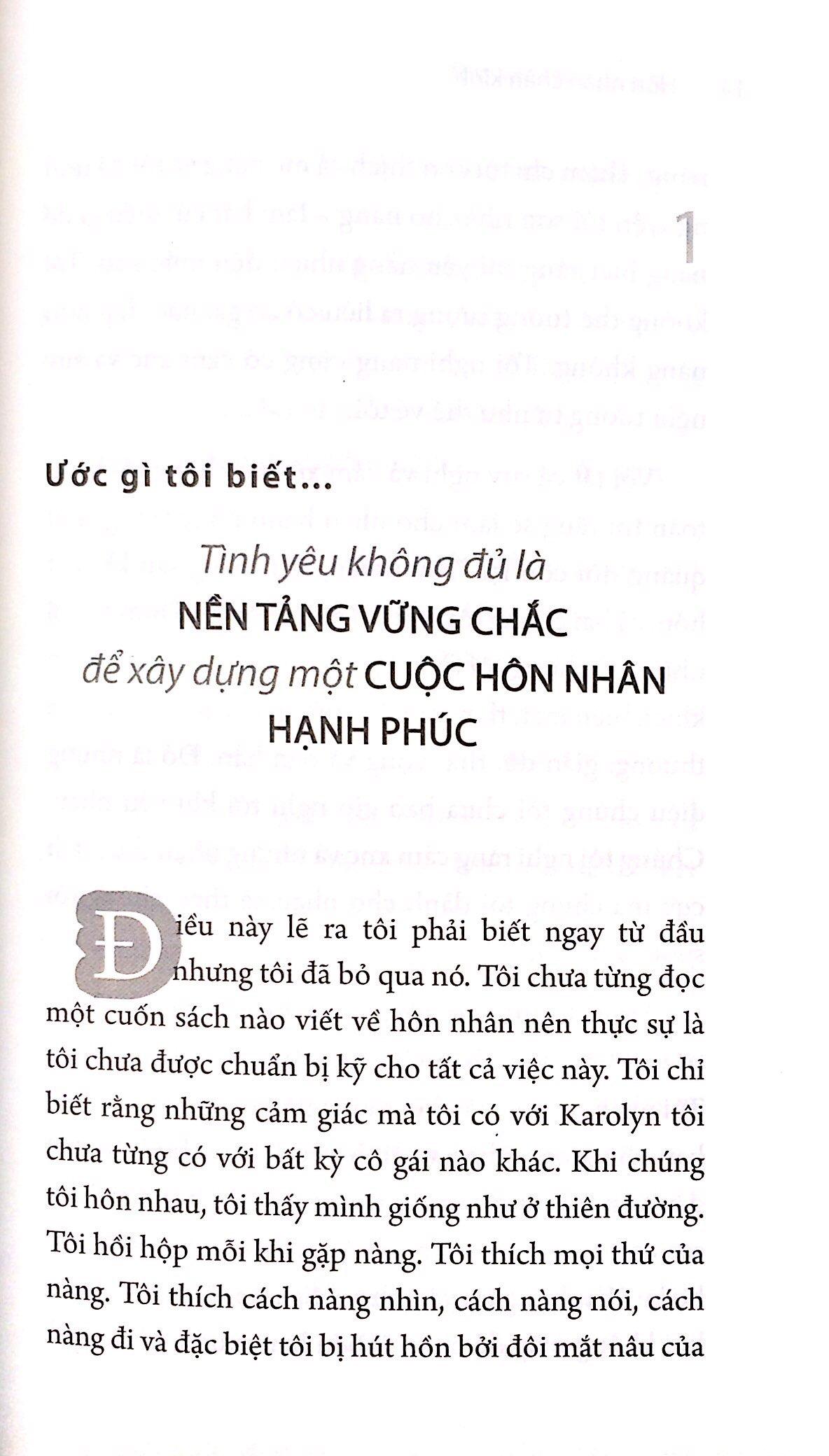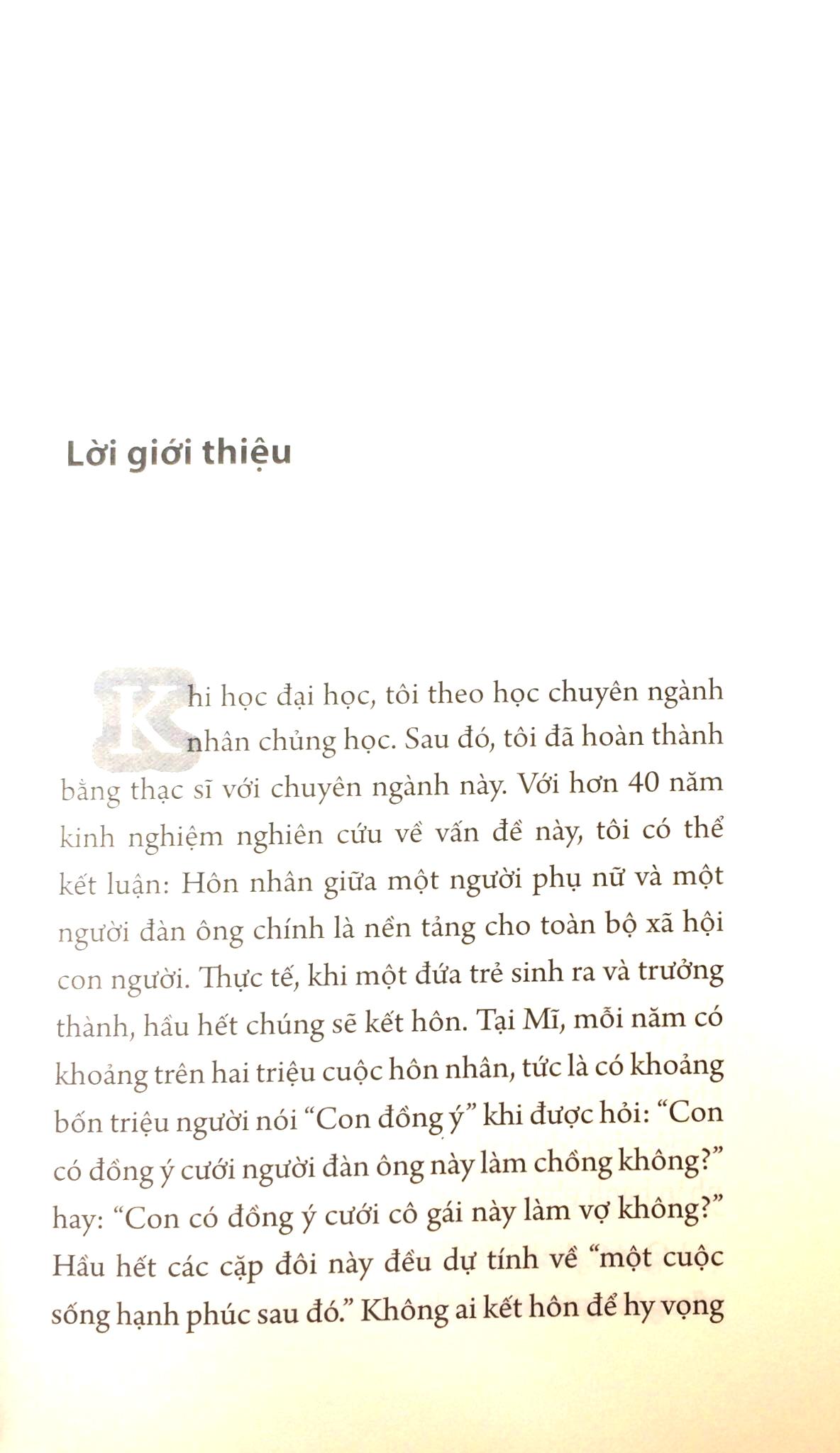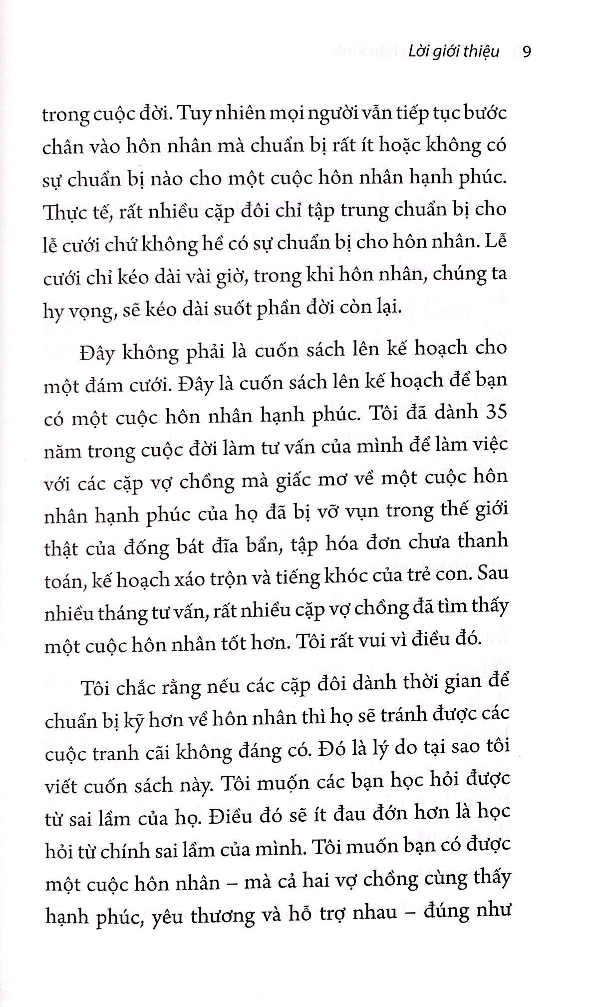 Với những cặp đôi đã kết hôn, cuốn sách này sẽ giúp bạn kiểm tra lại nền tảng và những kỹ năng cần thiết để xây dựng một cuộc hôn nhân hạnh phúc. Đây không chỉ là cuốn sách đơn giản để đọc. Đây là cuốn sách để trải nghiệm. Bạn phải trăn trở với những tình huống thực tế được thảo luận trong cuốn sách này và ứng dụng vào chính cuộc hôn nhân hay mối quan hệ của mình. Nếu bạn bỏ qua những vấn đề này và cho rằng cảm giác phấn khích mà bạn có trong thời gian yêu sẽ theo bạn suốt cuộc đời, thì bạn đã tự đưa ra thất bại cho chính mình. Hãy nhớ đám cưới chỉ là điểm bắt đầu và đừng để cuộc hôn nhân của bạn biến thành cái toilet - nơi mà người bên ngoài thì muốn vào còn người bên trong thì muốn mau mau chóng chóng đi ra.