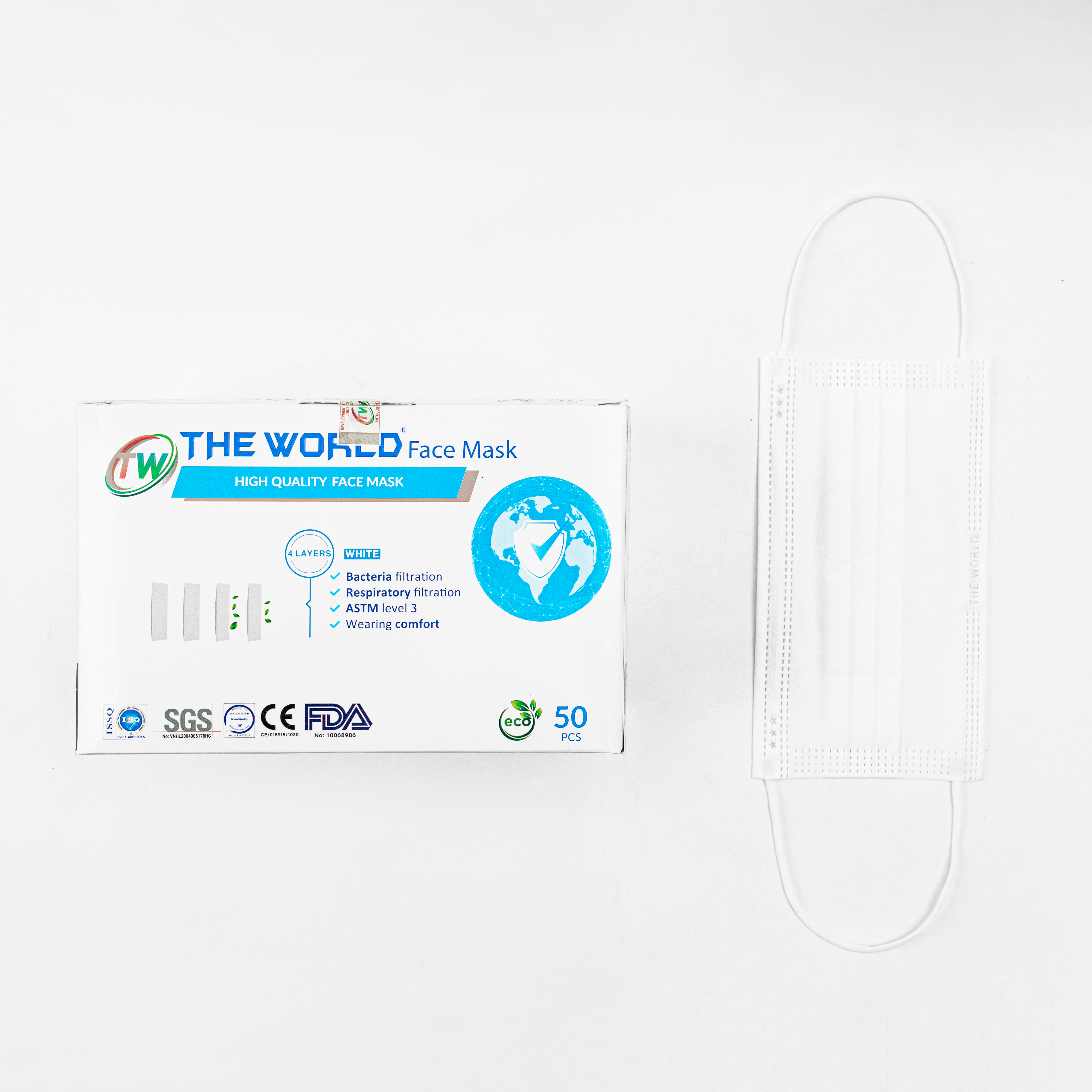 Mua tại Tiktok[HỘP-50 CÁI] Khẩu trang y tế 4 lớp The World kháng khuẩn, bụi mịn - Hàng Chính Hãng The World THÔNG TIN SẢN PHẨM KHẨU TRANG KHÁNG KHUẨN 4 LỚP THE WORLD Quy cách đóng gói : 50 chiếc/hộp Khẩu trang cao cấp The World được sản xuất theo công nghệ kháng khuẩn, cấu tạo 4 lớp, có tác dụng ngăn khói, bụi, vi khuẩn xâm nhập, phòng chống các dịch bệnh nguy hiểm lây qua đường hô hấp. Sử dụng hiệu quả khi lưu thông trên đường hay làm việc trong bệnh viện, môi trường công nghiệp độc hại.