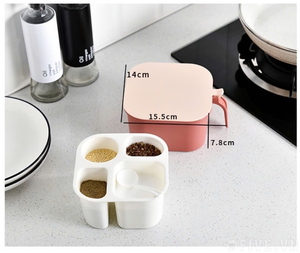 HŨ ĐỰNG GIA VỊ 4 NGĂN CÓ NẮP ĐẬY kèm thìa cao cấp - Henrysa Ưu Điểm Sản Phẩm Bộ sản phẩm gồm: 04 hũ đựng + 4thìa nhựa • Khay đựng gia vị 4