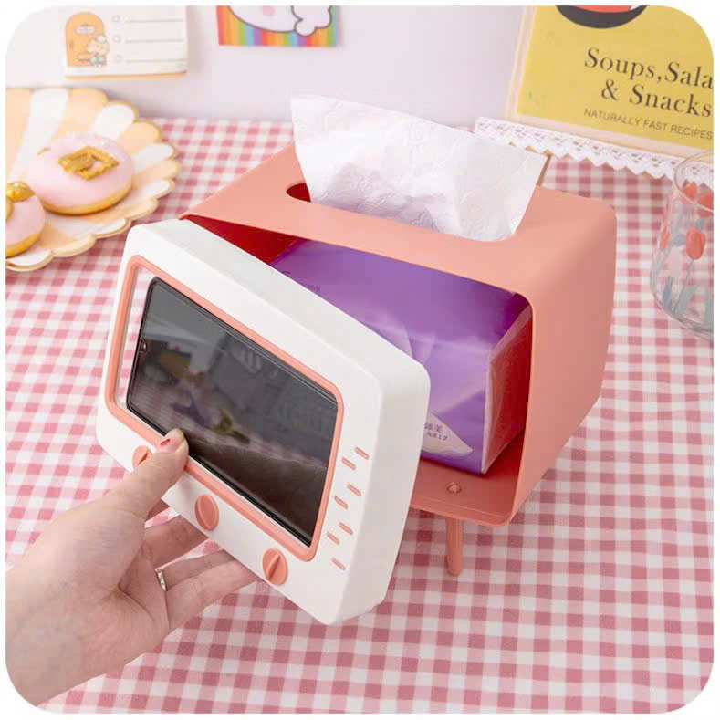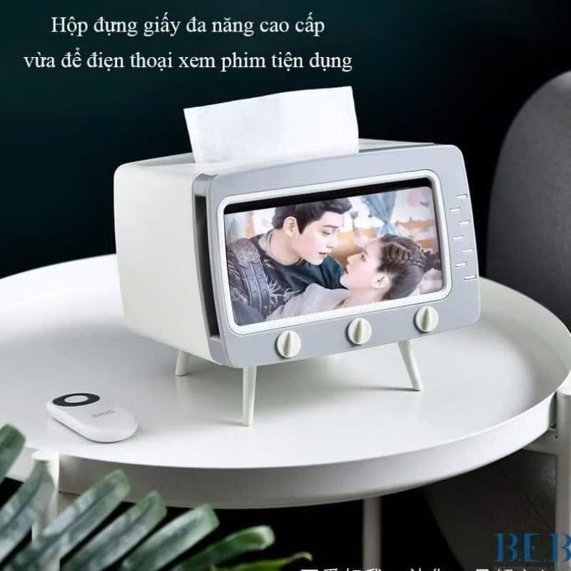 Thiết kế đẹp độc lạ hình dáng như chiếc tivi ngày xưa, mặt trước có chỗ để màn hình điện thoại, bên trong lại là hộp giấy ăn vô cùng tiện dụng, đặt trên bàn