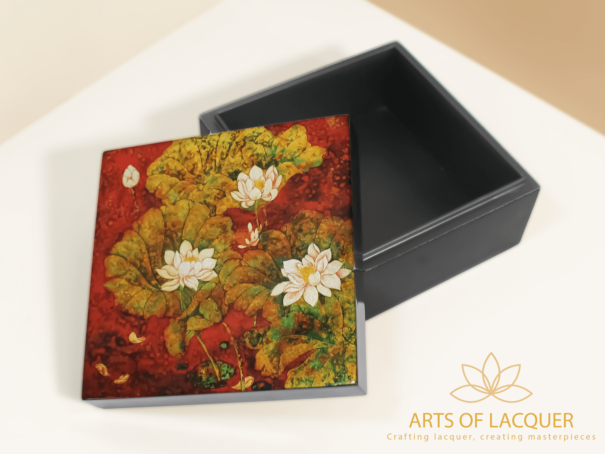 Sản phẩm trong hình là "Hộp Lưu Niệm Sơn Mài Họa Tiết Ao Hoa Sen" từ Arts of Lacquer. Hộp có thiết kế vuông với nền màu đỏ, được trang trí bằng hình ảnh hoa