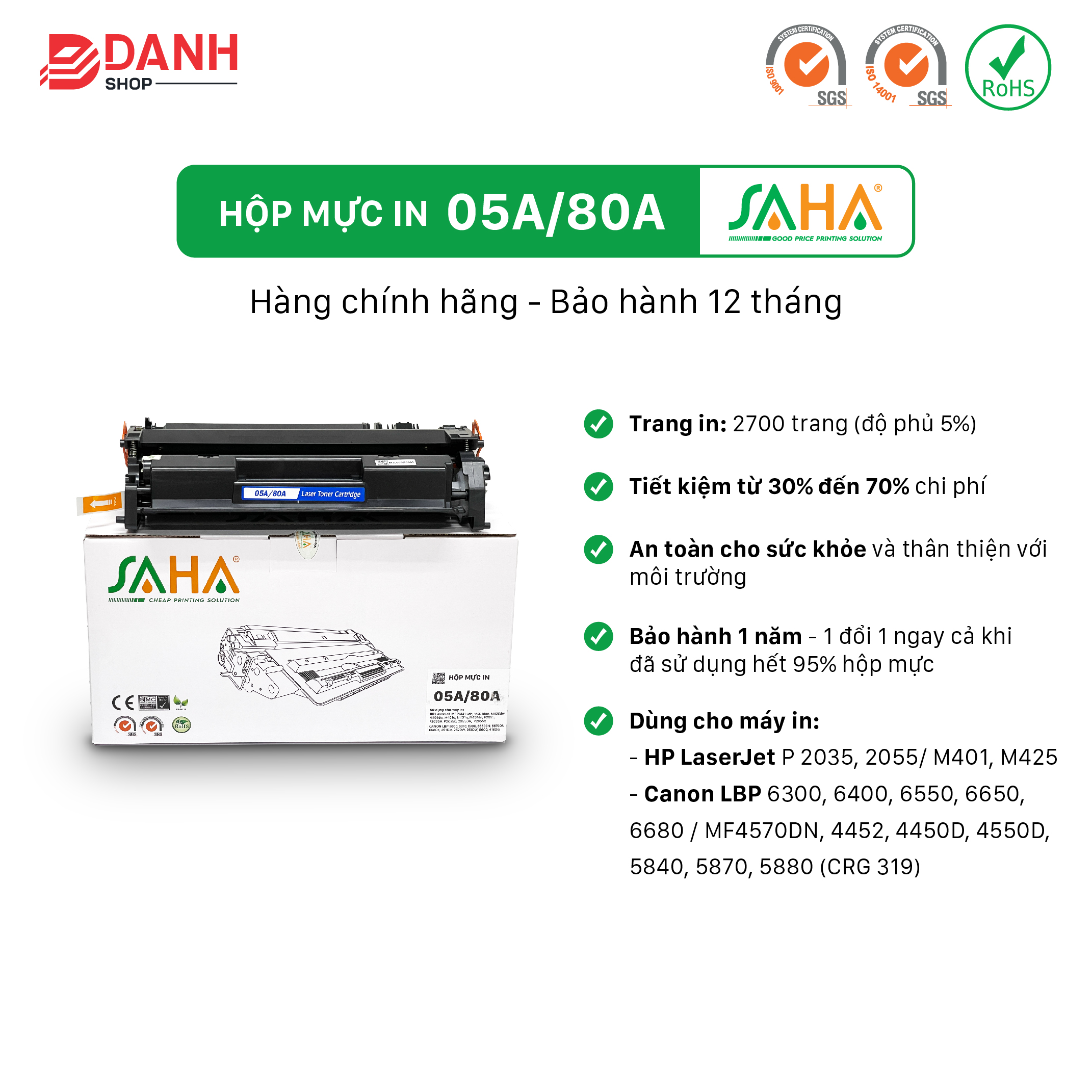 Mực in SAHA 05A/80A của Danhshop là thương hiệu mực in giá tốt với chất lượng ổn định lâu dài, được nhiều khách hàng tin tưởng và sử dụng nhất hiện nay. Sản phẩm đã được cấp các chứng nhận tiêu chuẩn chất lượng ISO 9001:2015, ISO 14001:2015.
