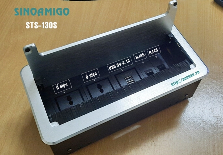 - Ổ cắm điện âm bàn Sinoamigo STS-130S có thiết kế dạng nắp lật, sử dụng bằng cách lật nắp về phía trước và nối các Jack cắm phù hợp, sau đó đậy lại tạo cho mặt bàn văn phòng. Giúp bàn làm việc của bạn vừa tiện nghi, trang nhã mà không làm tốn diện tích mặt bàn.